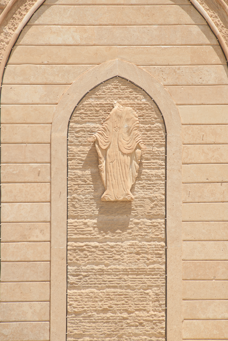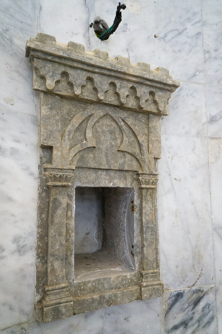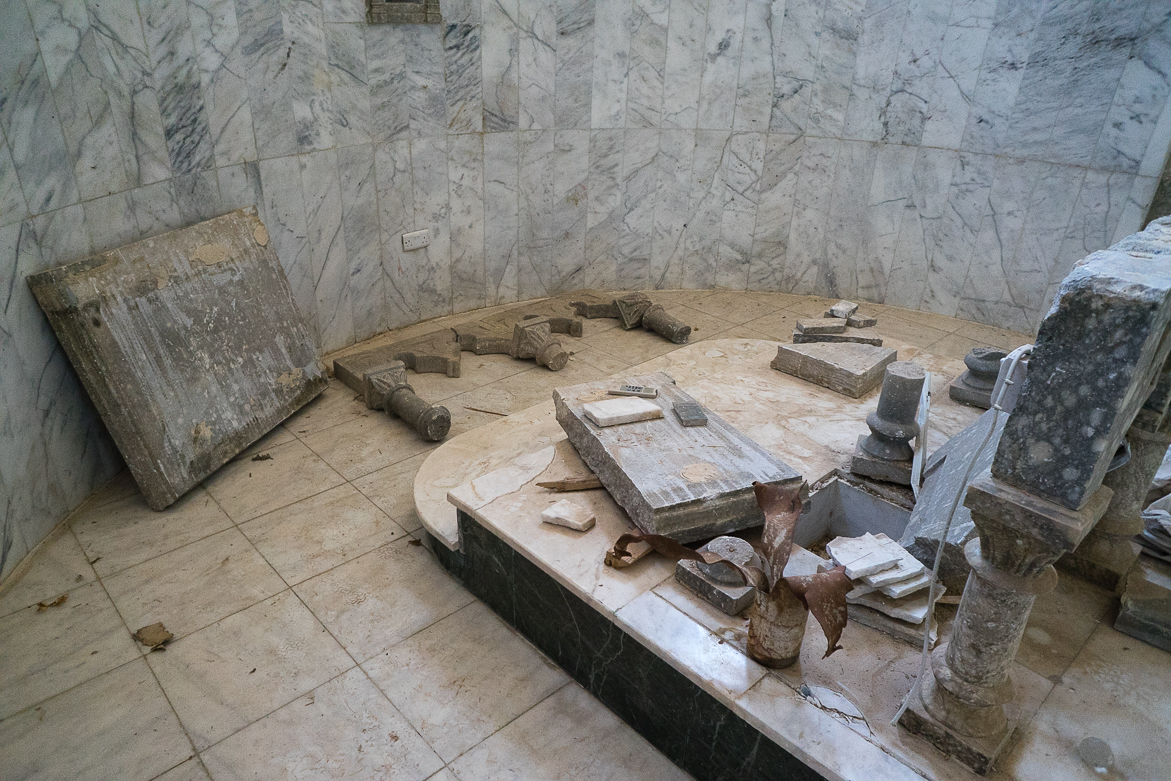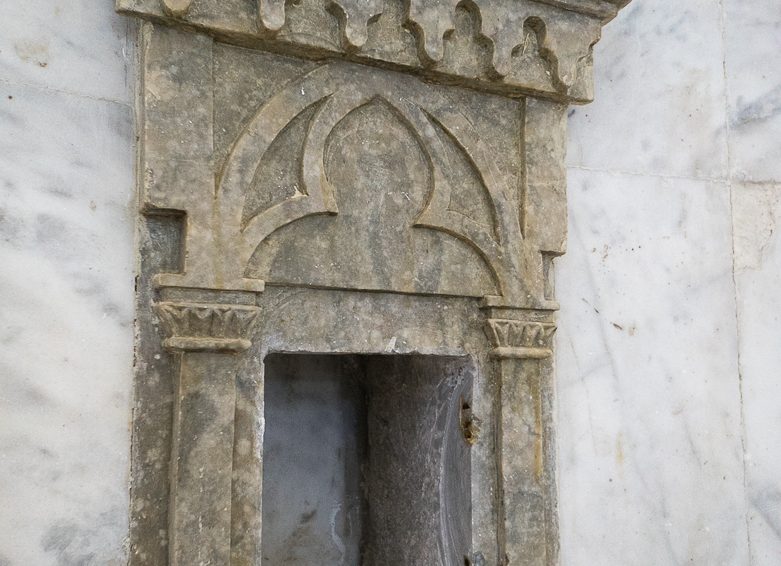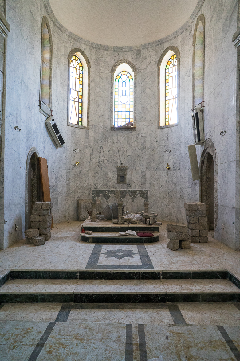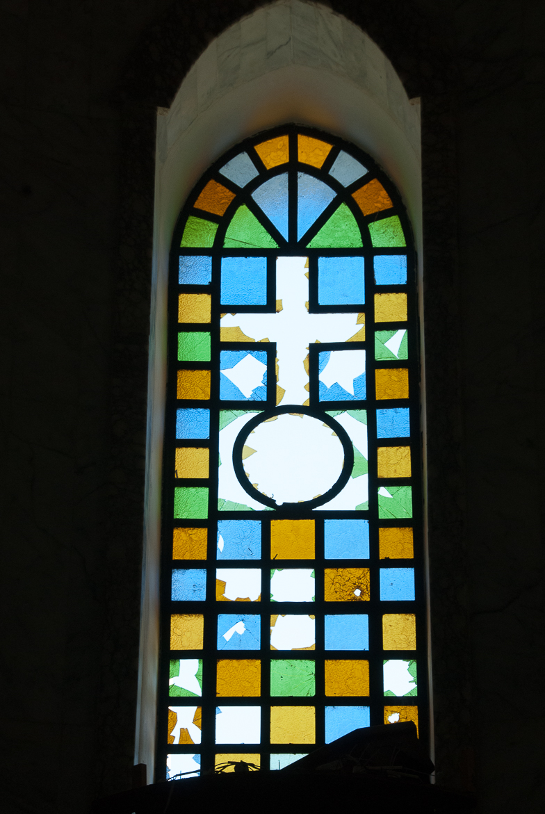 خلف المذبح ، ضمن الجدار النصف دائري ، تم تدنيس نافذة رخامية جميلة مزينة بالأعمدة حيث تم نزع أبوابها وتناثر ما بداخلها.