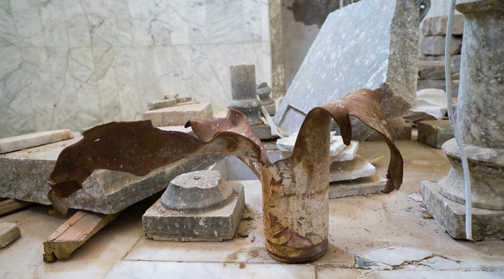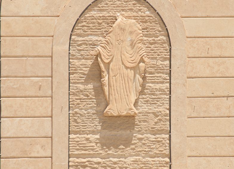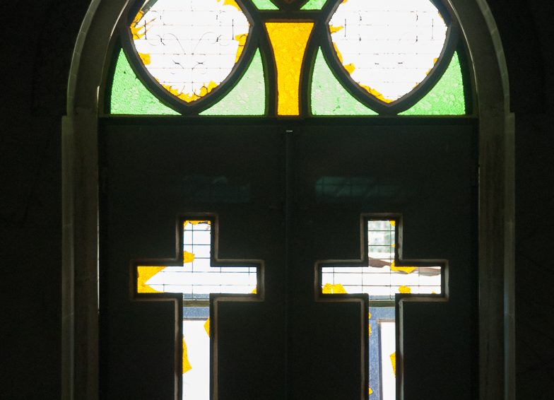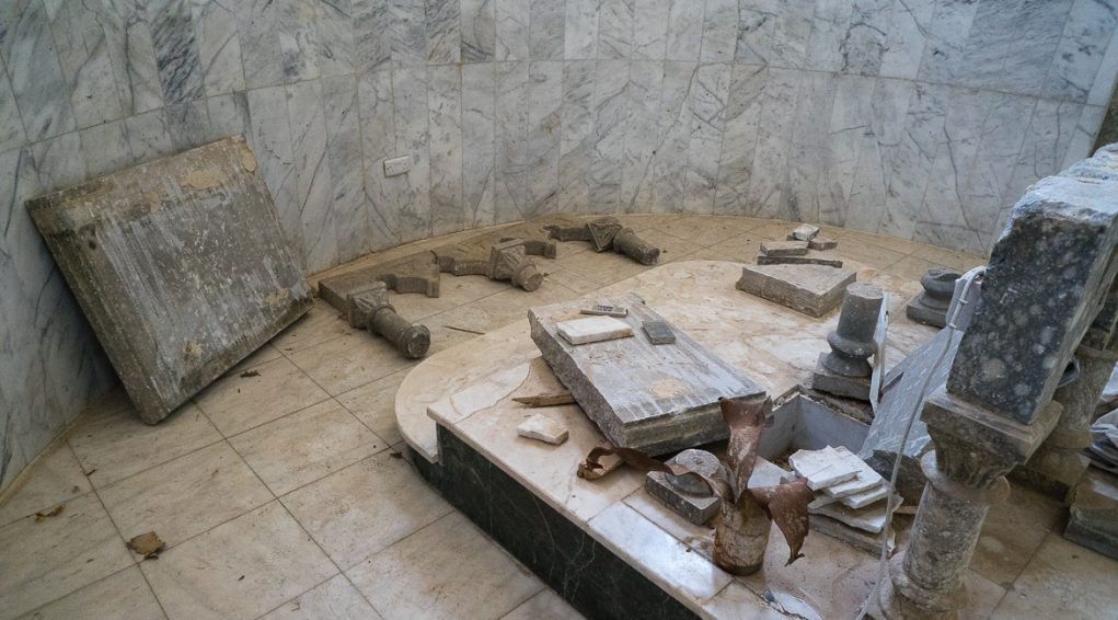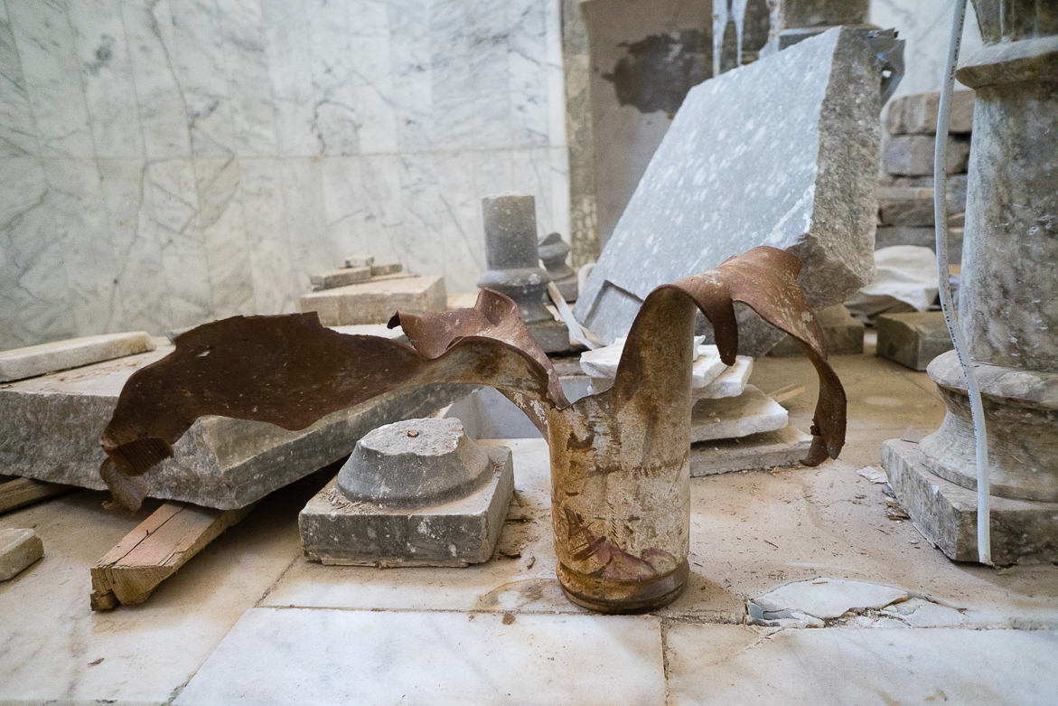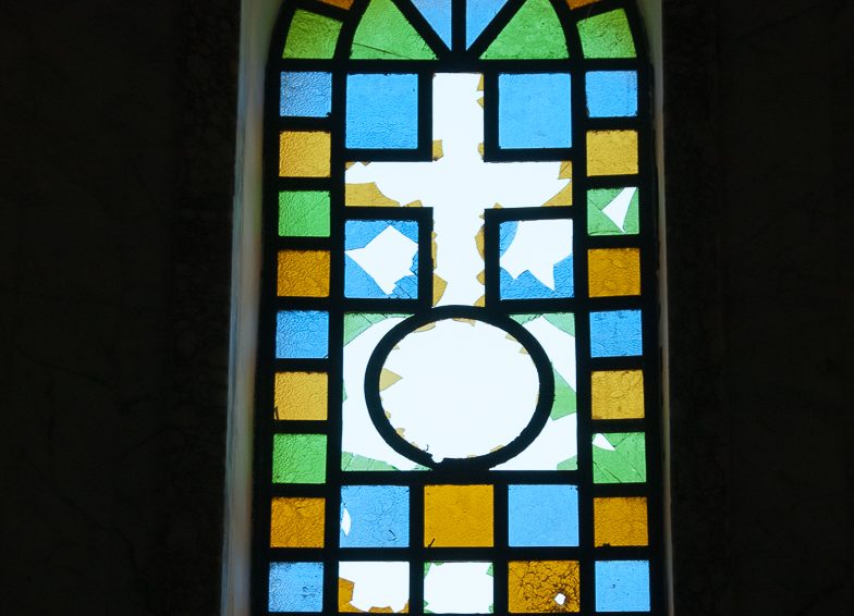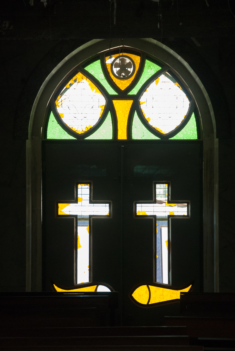 خلف المذبح ، ضمن الجدار النصف دائري ، تم تدنيس نافذة رخامية جميلة مزينة بالأعمدة حيث تم نزع أبوابها وتناثر ما بداخلها.