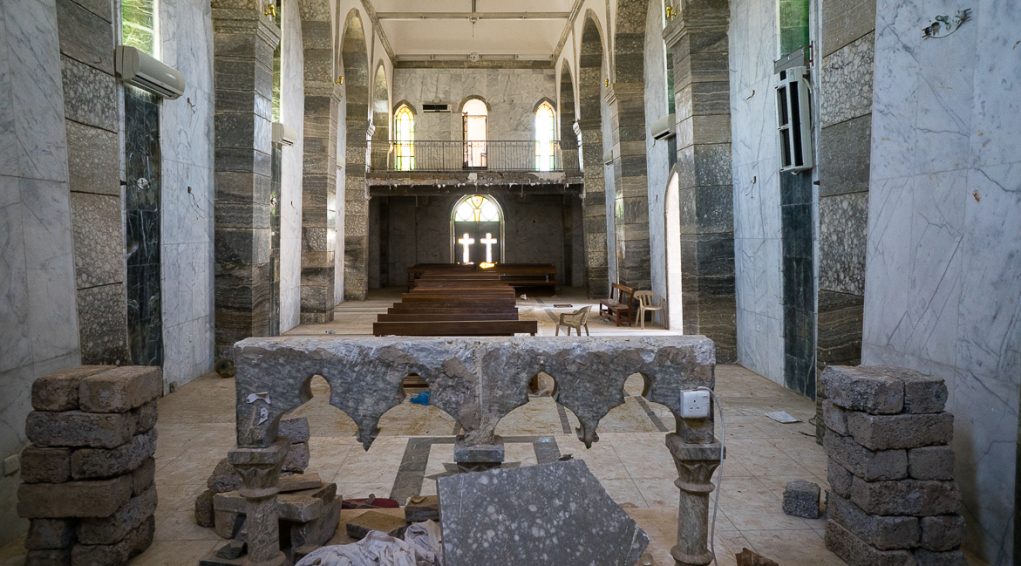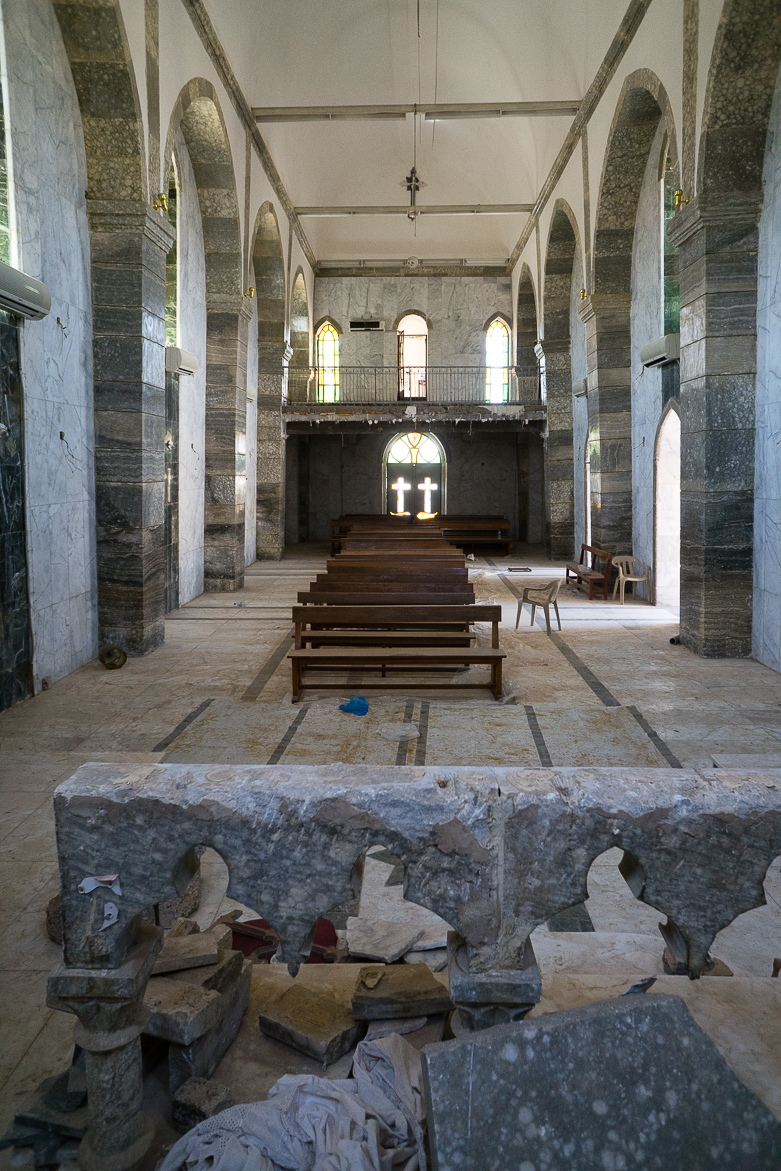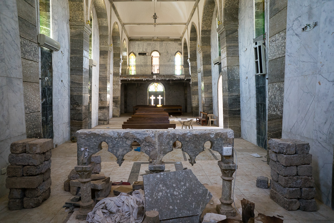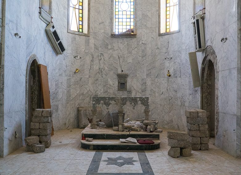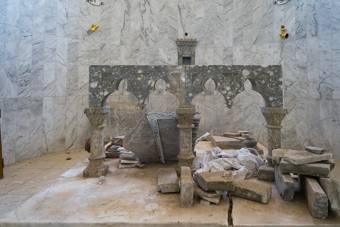 كان يوجد في قلب المكان المقدس مذبح رخامي جميل مع أعمدة وقناطر متعددة والذي تعرض للنهب من قبل الجهاديين الذين قاموا أيضاً بتدمير الأثاث.