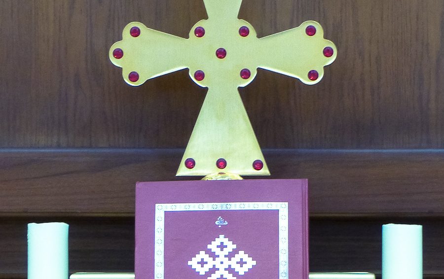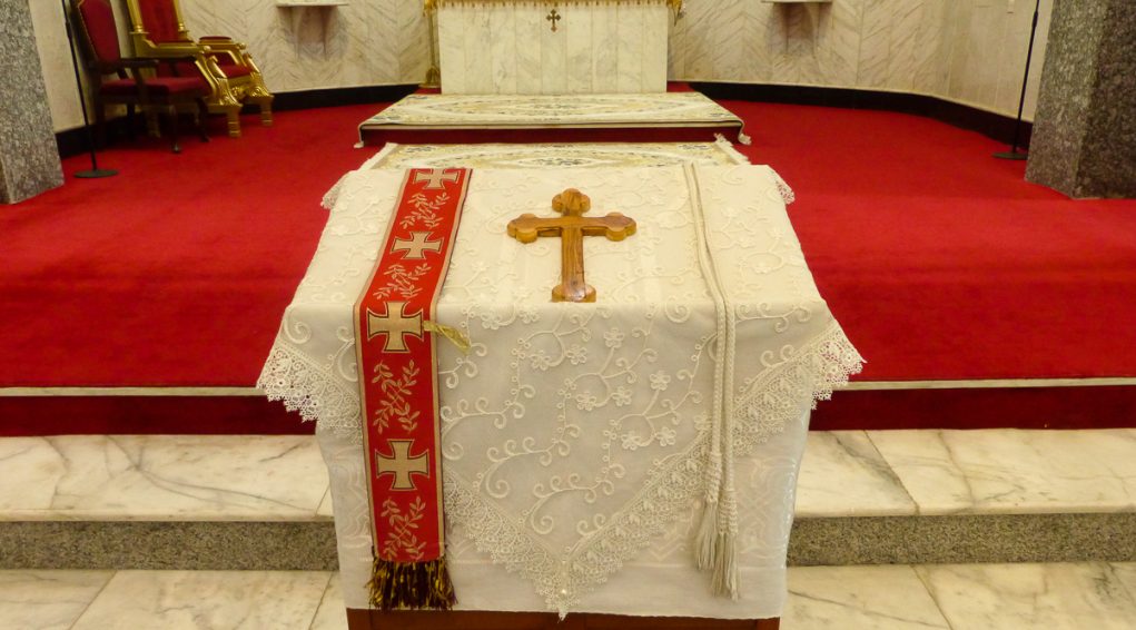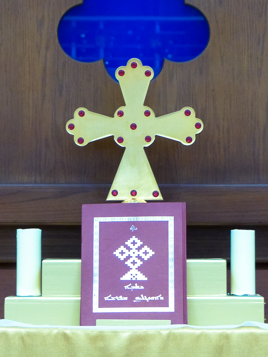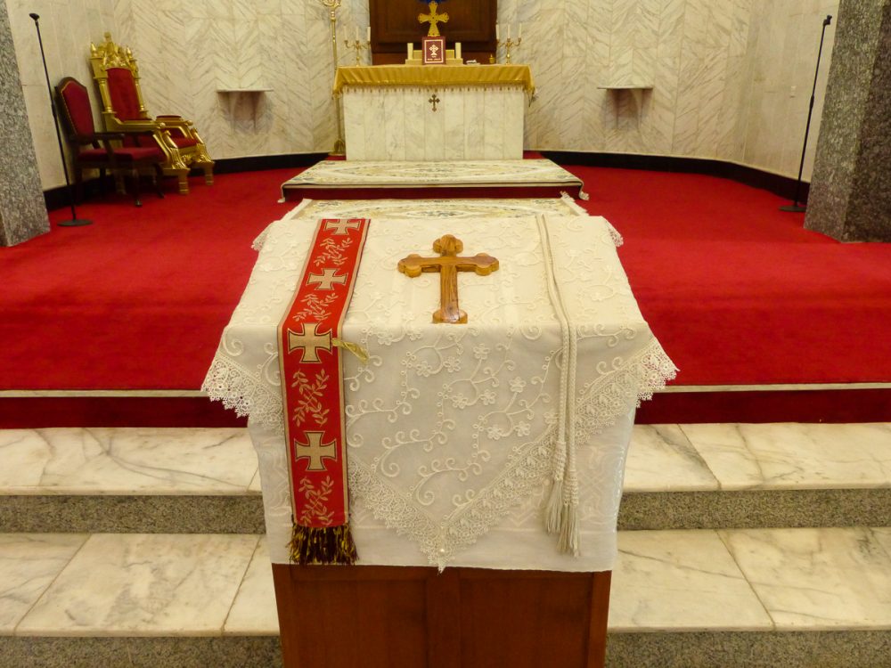 In the middle of the church, a lectern with a wooden cross on top of it, stands as a symbol of the former pulpit, the bima[1]in Syriac language, symbol of Jerusalem, and where the celebrant in old days used to deliver his homily. In modern churches, the pulpit is replaced by a lectern with a cross on top of it and placed in the centre of the congregation.