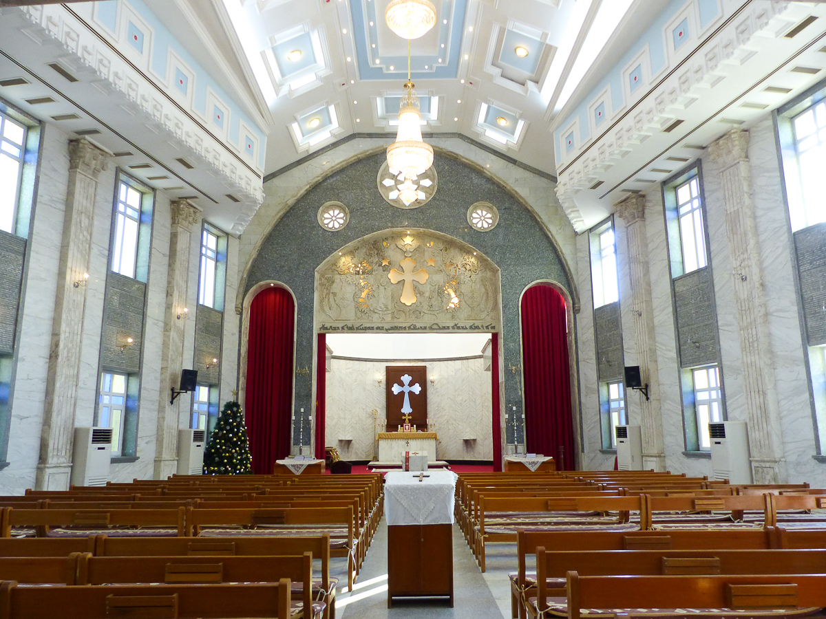 The cathedral of the Assyrian Church of the East, Mar Yohanna al Ma’amadan (Saint John the Baptist) lies at 36°13’55.46″N 43°59’36.61″E and 410 metres high, in the city of Ankawa.