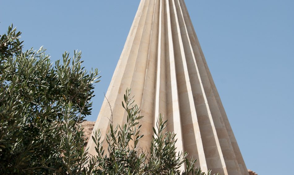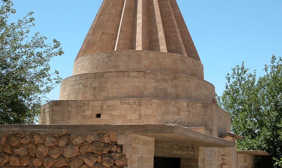 Mausoleums with a conical, striped dome are emblematic of Yazidi sacred art. Extremely sober in terms of its architecture and decoration, this type of building is built on a cube structure which contains the tomb or cenotaph, covered by a slab with a drum, above which stands a conical dome composed of multiple crests. This vault symbolises the sun’s rays which light up the earth and humanity.