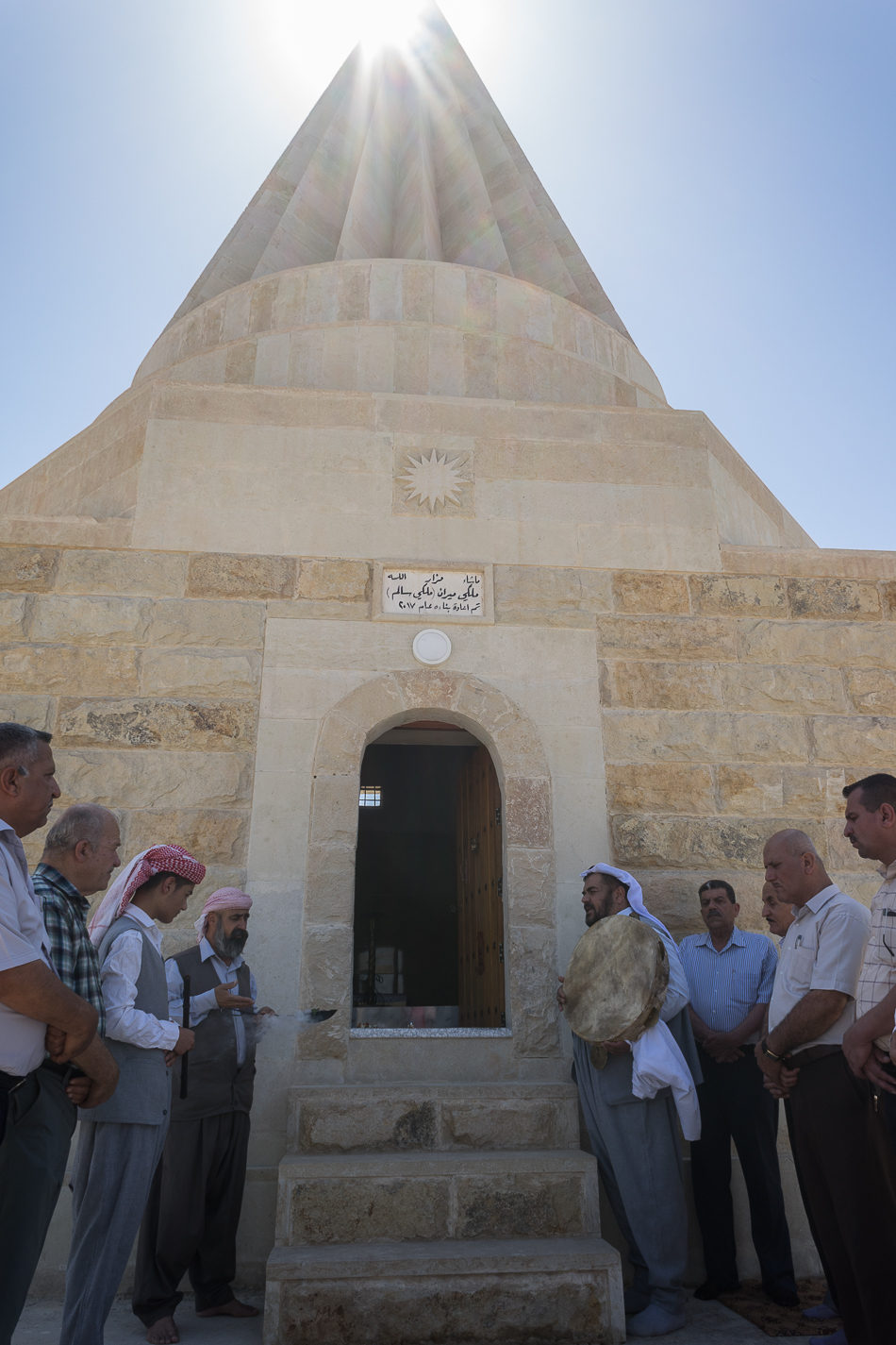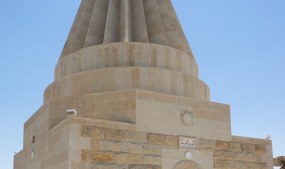 Mausoleums with a conical, striped dome are emblematic of Yazidi sacred art. Extremely sober in terms of its architecture and decoration, this type of building is built on a cube structure which contains the tomb or cenotaph, covered by a slab with a drum, above which stands a conical dome composed of multiple crests. This vault symbolises the sun’s rays which light up the earth and humanity.