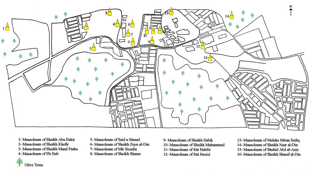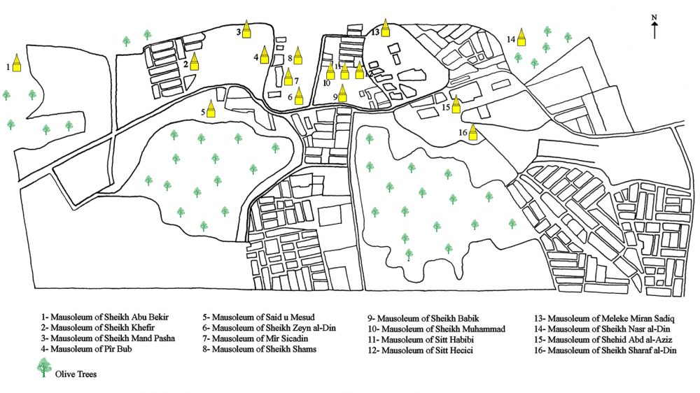 These buildings are mostly dedicated to the first disciples of the 12th century Yazidi reformer, Sheikh ‘Adî, members of the Chamsani families and families such as Hasan Maman, Memê Rech and Cerwan, as well as the community’s first religious leaders, descendants of Sheikh ‘Adî (members of the Adani family) and certain important Sufi mystics who influenced Sheikh ‘Adî’s teachings, namely Abd al-Qadîr al-Jilani, al-Hallaj et Qedib al-Ban (Qadî Bilban).