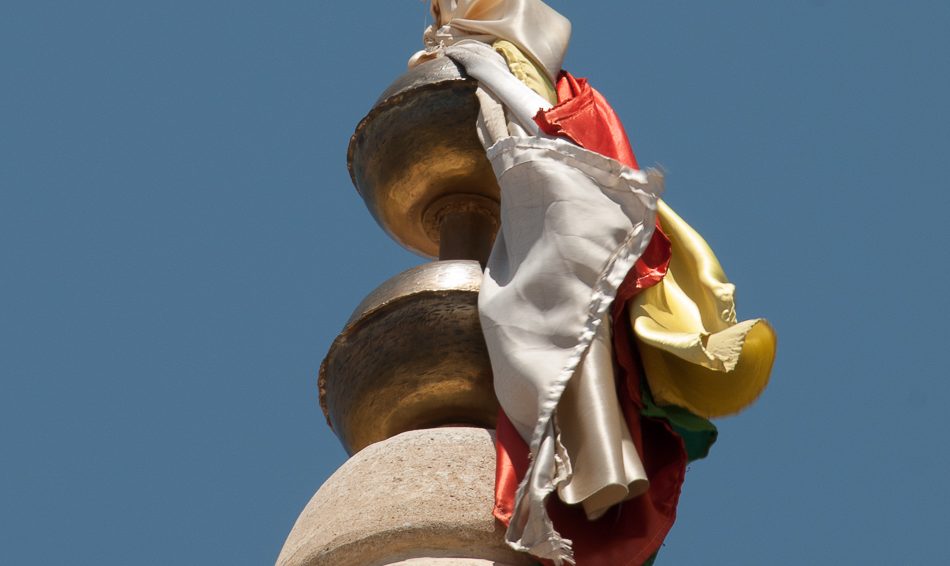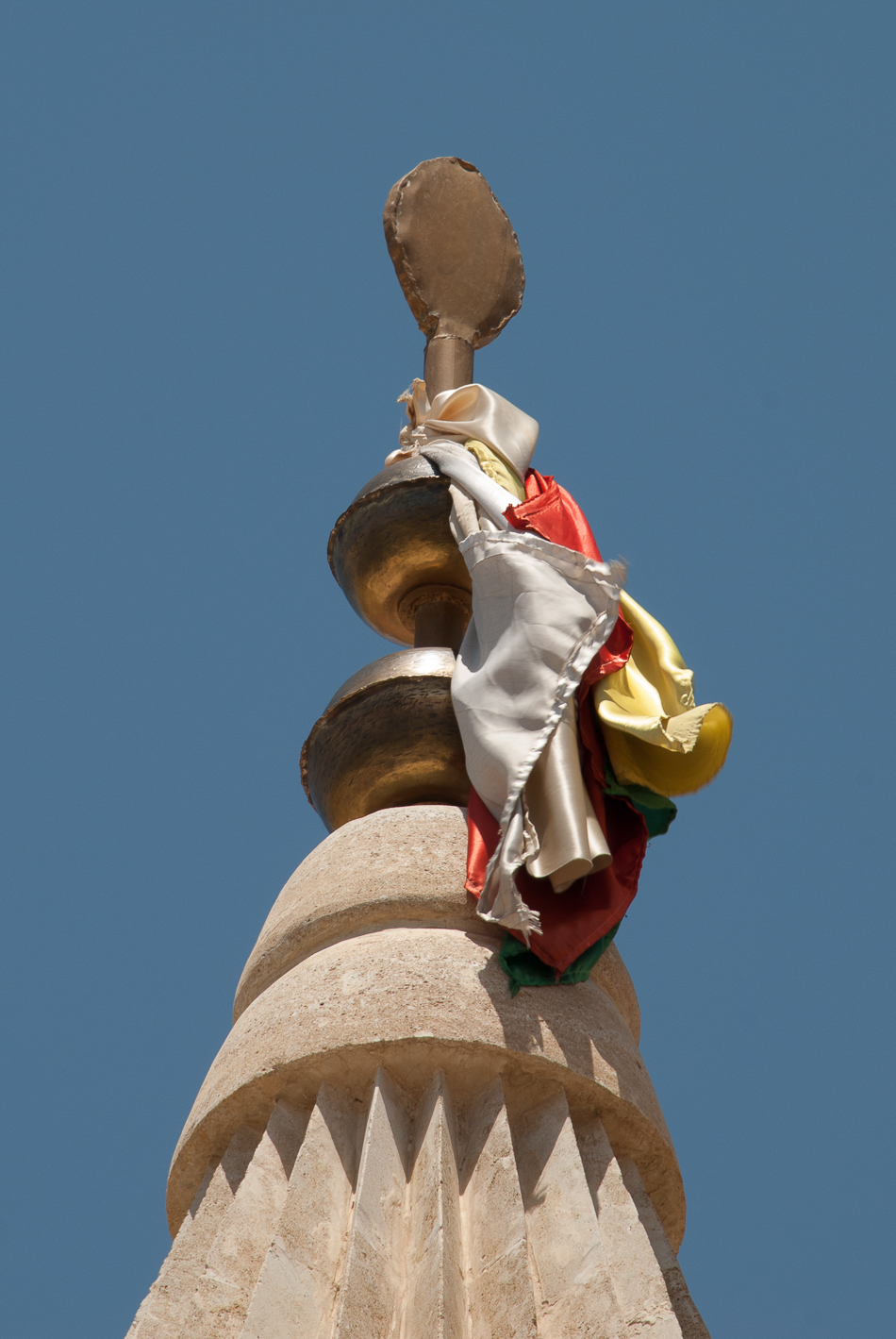 The pinnacle of the dome is systematically fitted with a bronze spire formed of one or more spheres, mounted with a ring, a crescent moon, and a celestial body or hand, around which swathes of coloured fabric are knotted. The spire represents the cosmos, the planets, the sun and the stars created by God. The coloured fabrics represented the colours of the rainbow. [1]