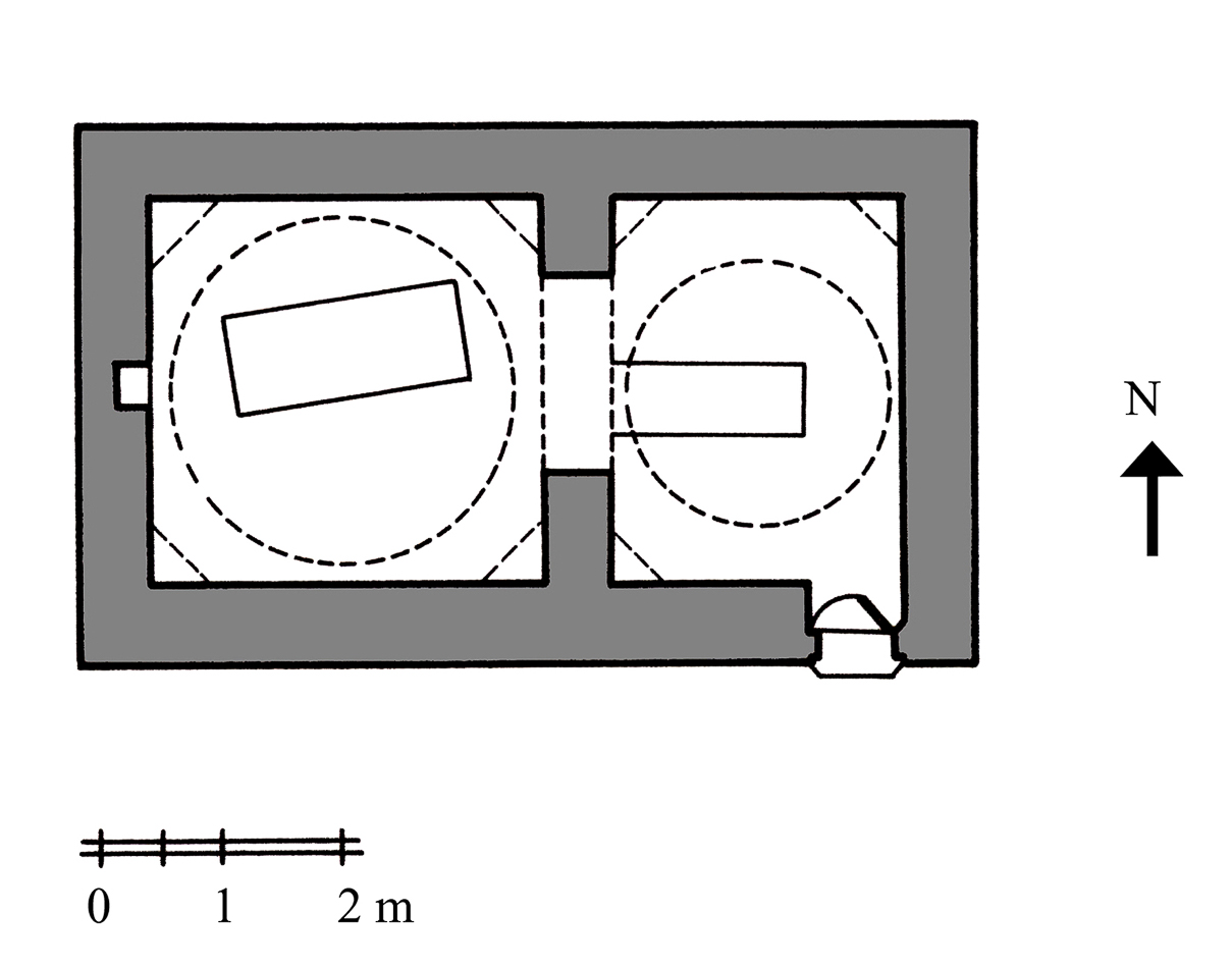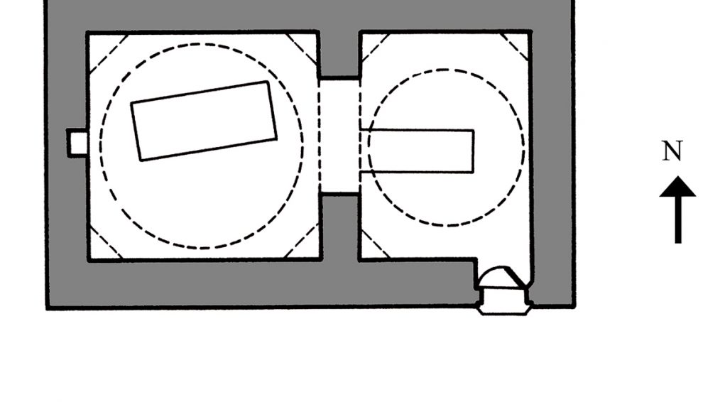 From the exterior, the mausoleum has a rectangular floor plan and is oriented from east to west. It is made up of two parts: the main section and the antechamber. The antechamber to the east can be accessed by a lowered door in the south wall. The antechamber has a rectangular floor plan measuring 3.2 x 2.4 metres. It is overlooked by a dome but the ceiling is flat on the outside. There is a coffin in the middle of the room, oriented from east to west. The two sections are connected by a semi-circular arch that is 1.6 metres wide.
