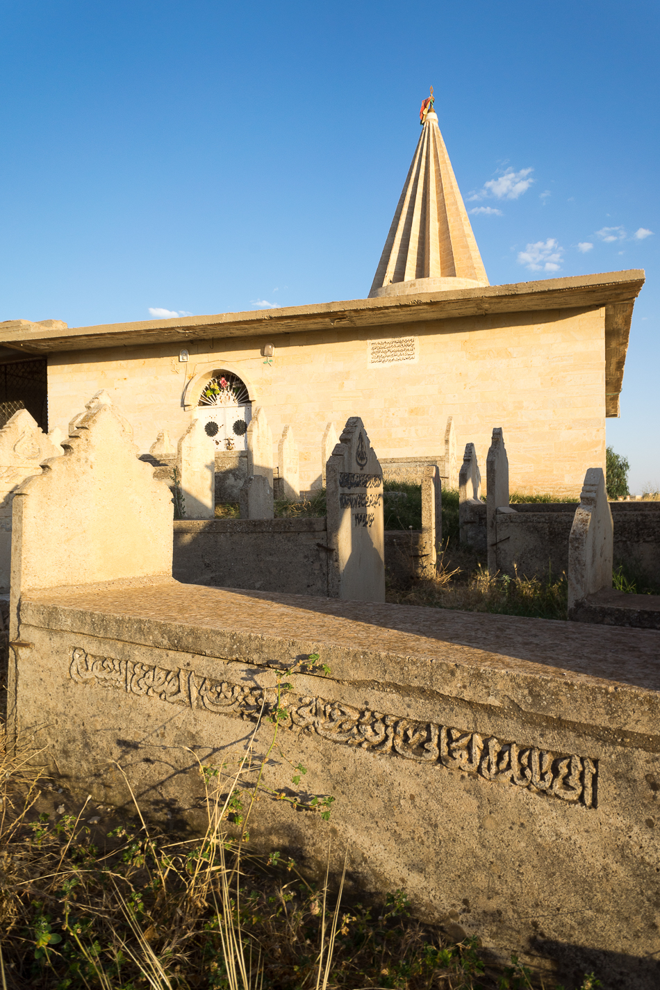 Mausoleums with a conical, striped dome are emblematic of Yazidi sacred art. Extremely sober in terms of its architecture and decoration, this type of building is built on a cube structure which contains the tomb or cenotaph, covered by a slab with a drum, above which stands a conical dome composed of multiple crests. This vault symbolises the sun’s rays which light up the earth and humanity.