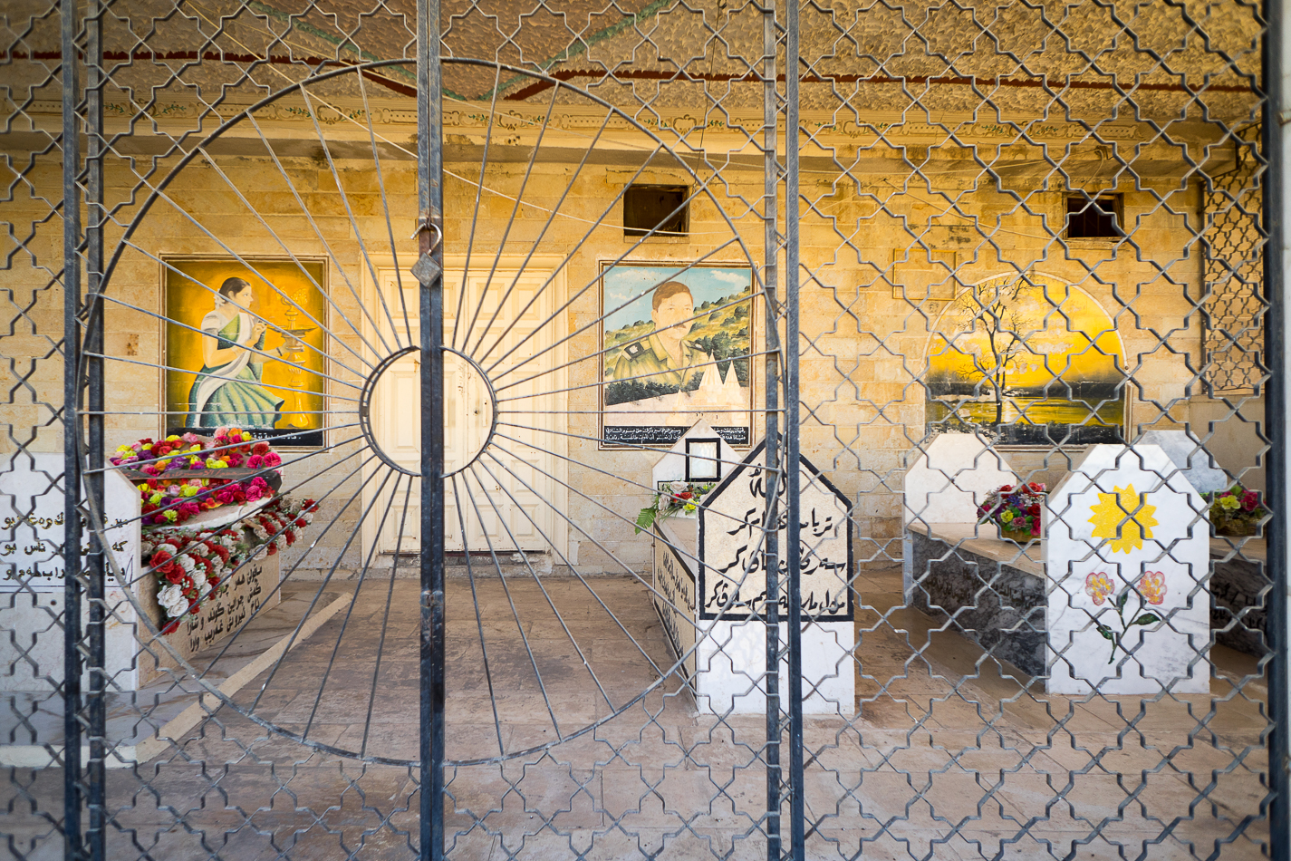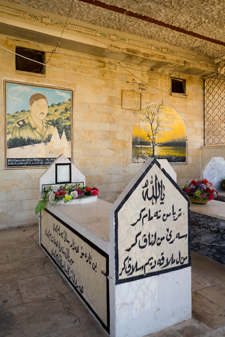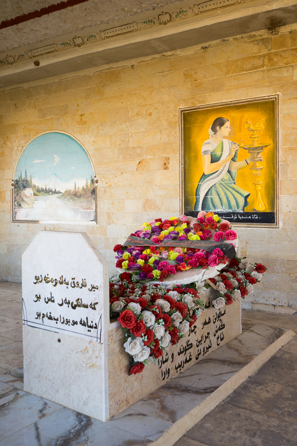 The sacred space in any Yazidi mausoleum includes the slab in front and around it. That is why any visitor or pilgrim must remove their shoes.