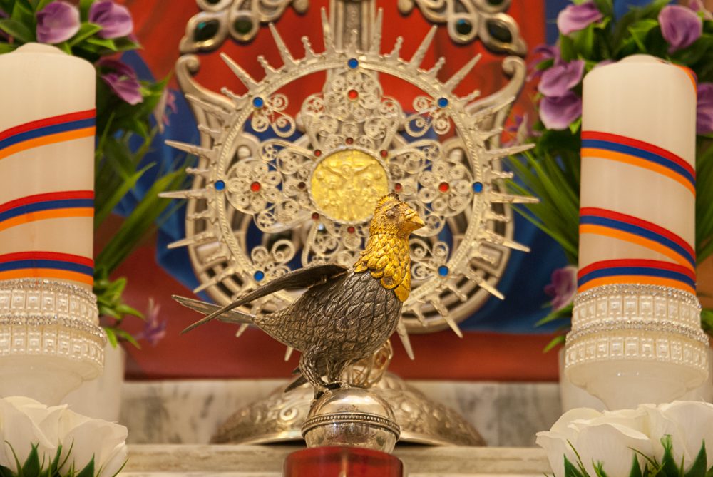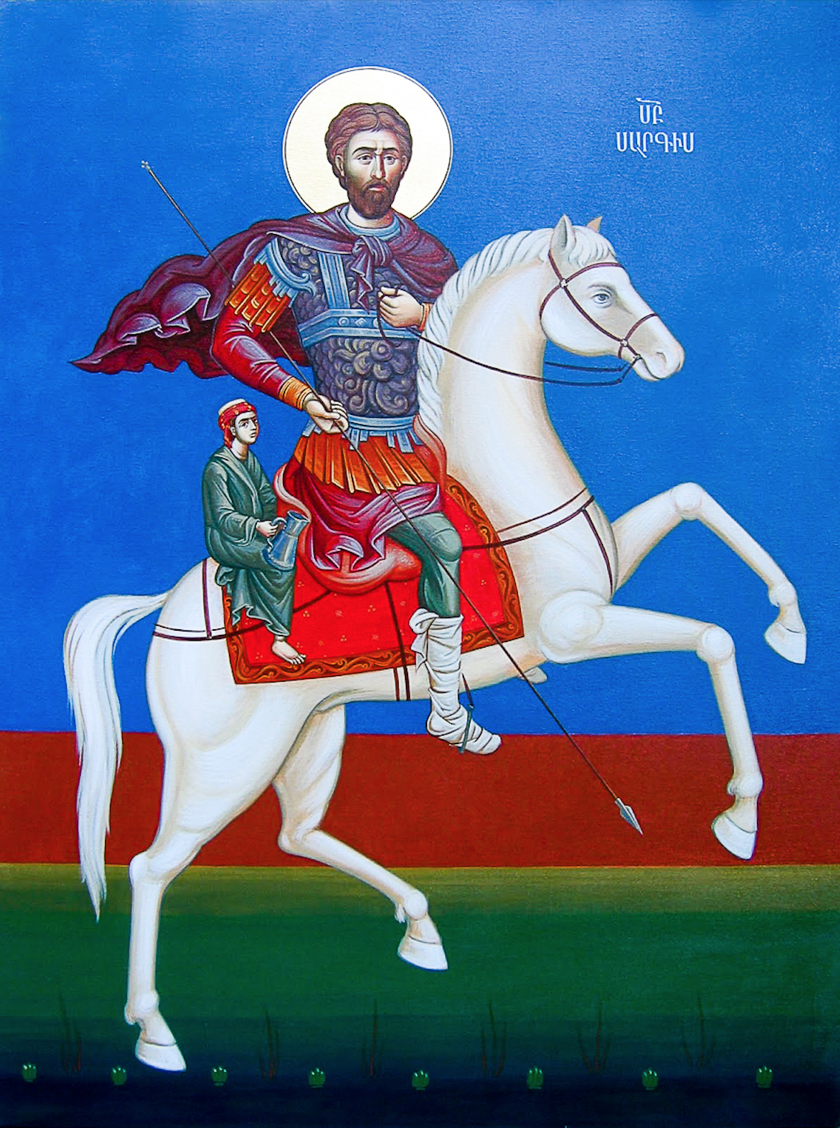 Celebrated for his bravery and faith, Sarkis is represented riding a horse with his son Mardiros. They were both made saints by the Armenian Apostolic Church.