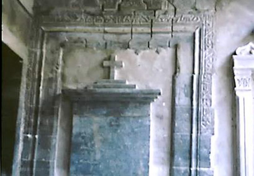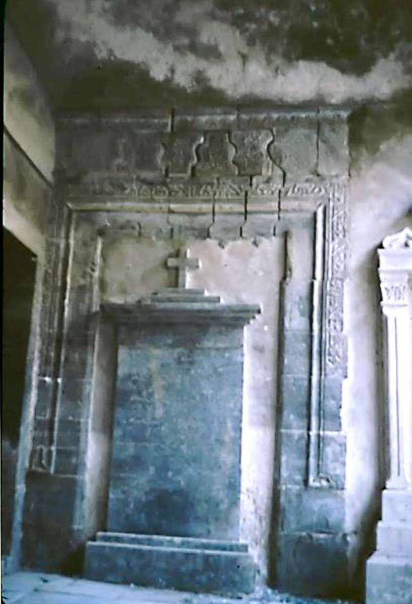 The women’s door from the ancient church was also preserved. Dated from the 13th century this marble door in the Atabeg style has a lintel composed of seven embedded, sculpted stones. All around the door an inscription is engraved in Syriac Estrangelo, reading: “Here is the door to the house of God, the Holy Spirit lies within, enter here in justice, and receive the Lord on High.” This door was walled in and used to marked out a grave.