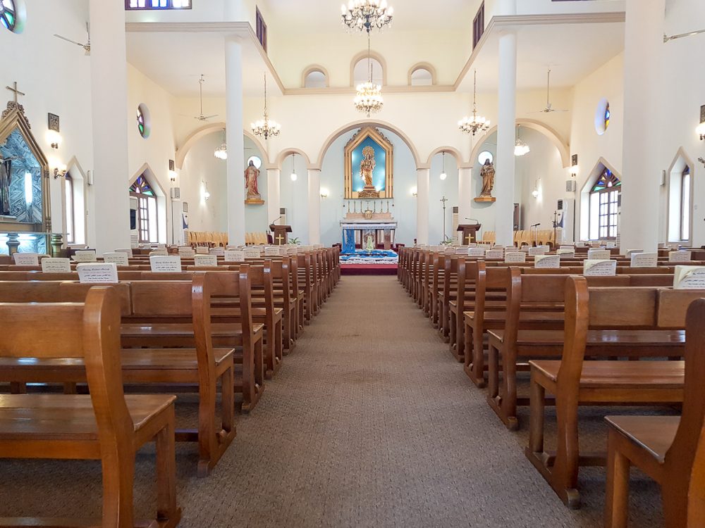 The fully open sanctuary is preceded with a platform equipped with lecterns. The royal door of the sanctuary is composed of three large semi-circular arches and two smaller decorative arches. Behind the altar, in the wall of the apse chapel is a small statue under a painting of the Virgin Mary, Queen of the Rosary, carrying the Infant King.