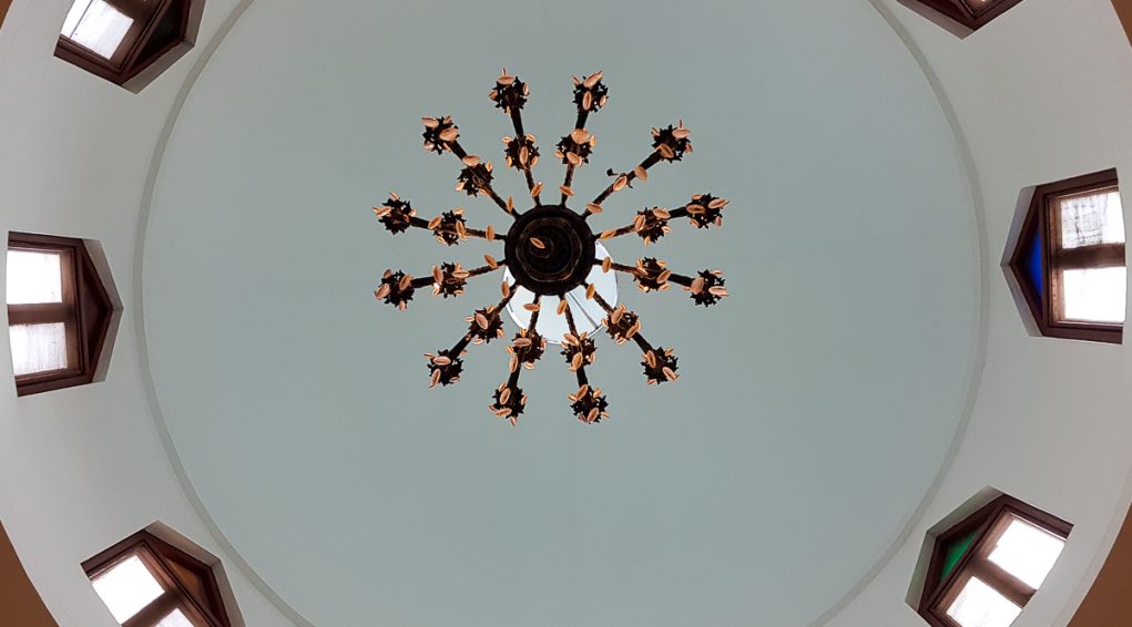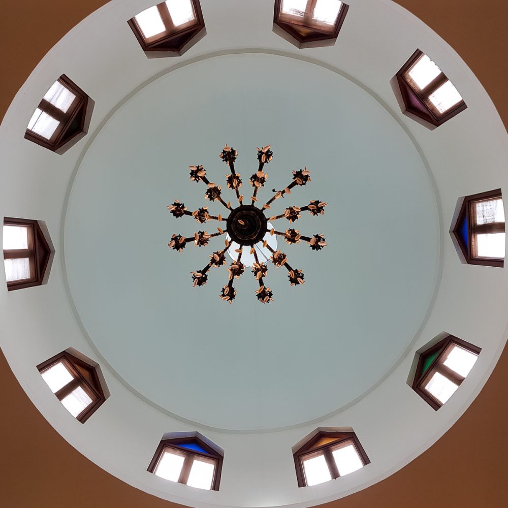 The reinforced concrete building has a basilica floor plan with a central nave and two side aisles separated by three pairs of cylindrical pillars. Perforated with a series of pointed arch windows, the Chaldean Our Lady Queen of the Rosary church is mounted in the centre with a cupola with a cylindrical drum and eight clerestory windows, capped with a semi-spherical dome and lantern.