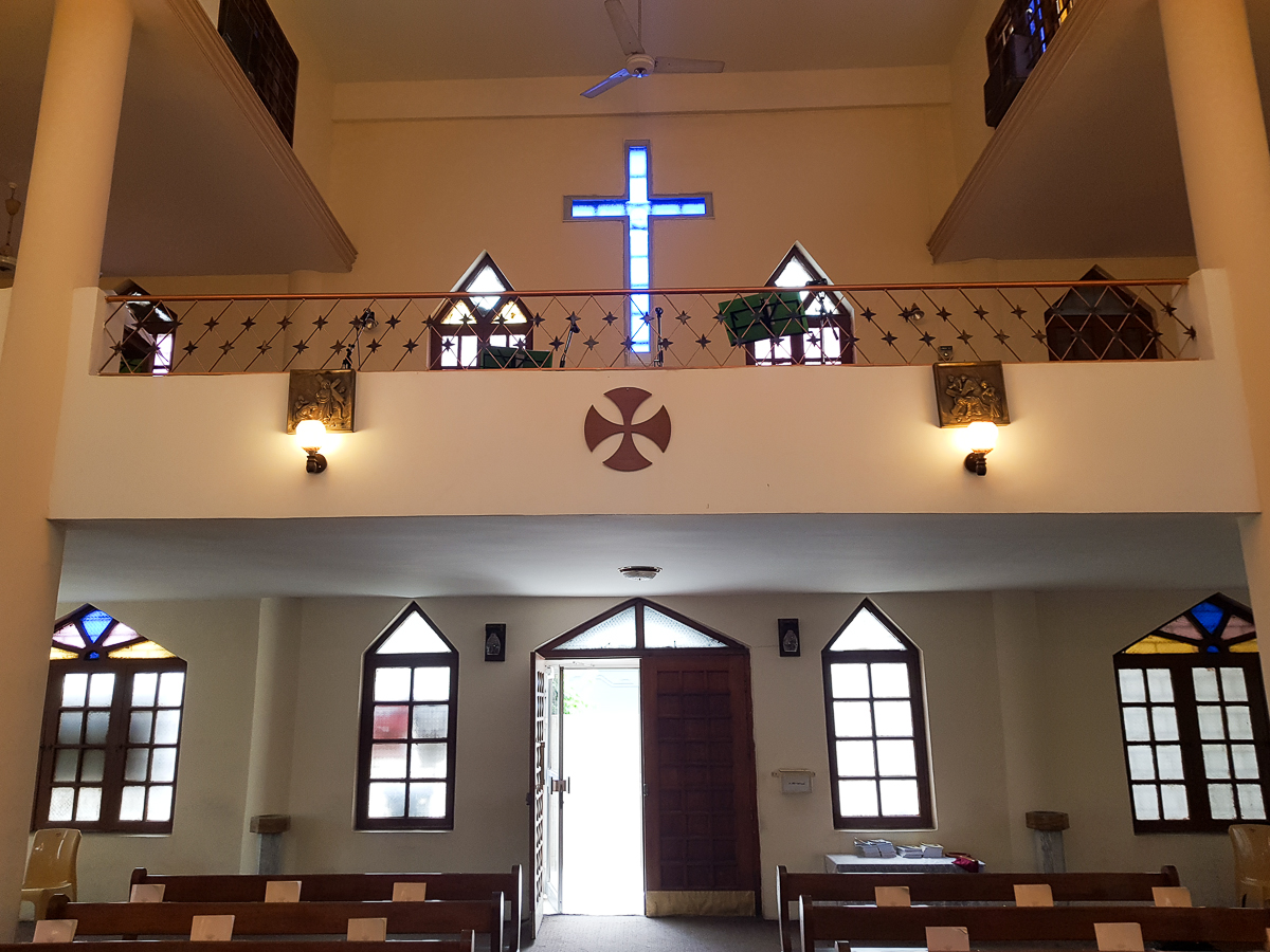 The church is entered via a simple wooden door aligned with the sanctuary, above which is a large tribune for the choir running the full width of the church.