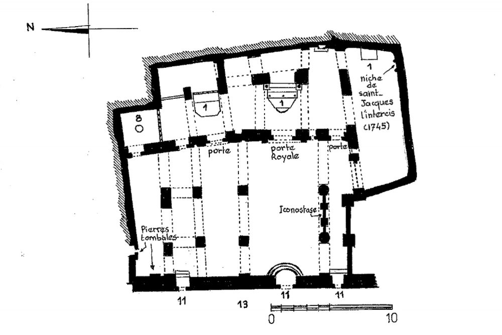 | Plan of the Syriac-Catholic Al-Tahira church (ancient) in Mosul 1: Altar. 8: Baptistery. 11: Doors. 13: oratory © in “Les chrétiens de Mossoul et leurs églises pendant la période ottomane de 1516 à 1815.” Fr.Jean-Marie Mérigoux, o.p., Mossoul-Ninive, 1983, p.117, A. |