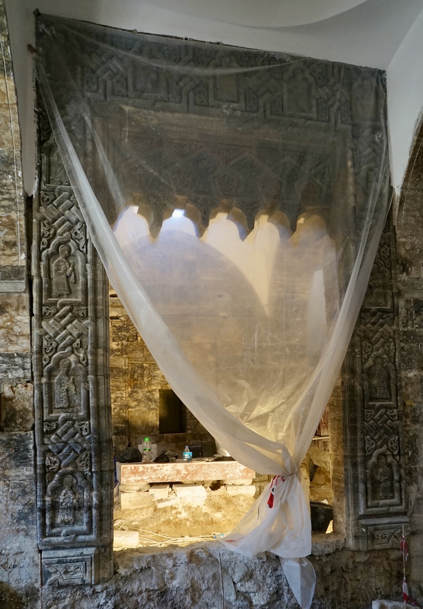This royal door was moved back a few metres in 1848 to align with the sanctuary of the new Mar Touma church, twinned with the ancient church on the south side. Today, the remains of Mar Theodorus are found on the left-hand pillar which this royal door formerly backed on to. They were “solemnly installed in the 17th century in the pillar of the door of the twelve apostles and were presented to be revered by the faithful.”[1]