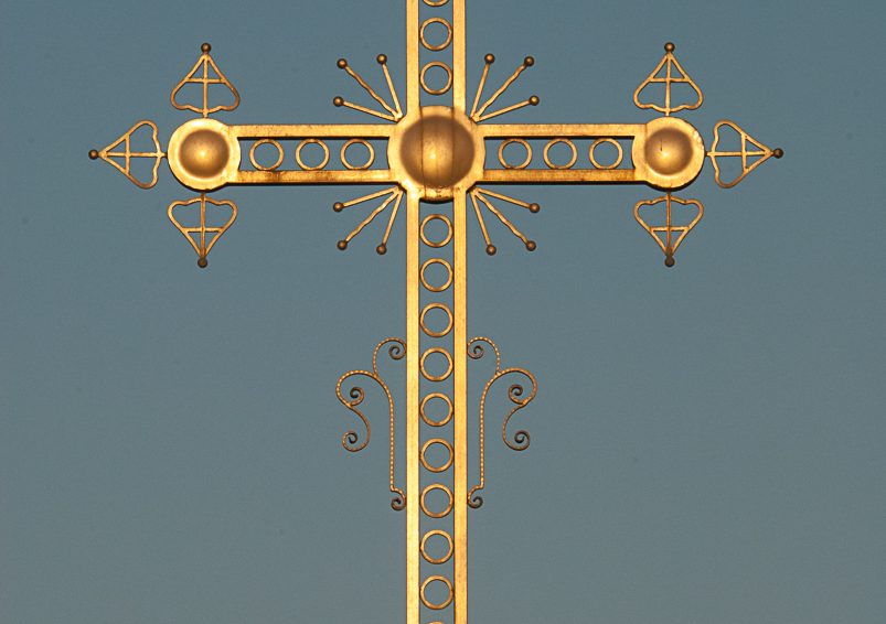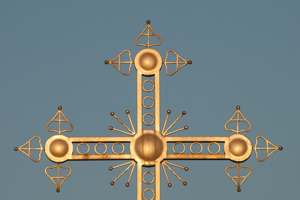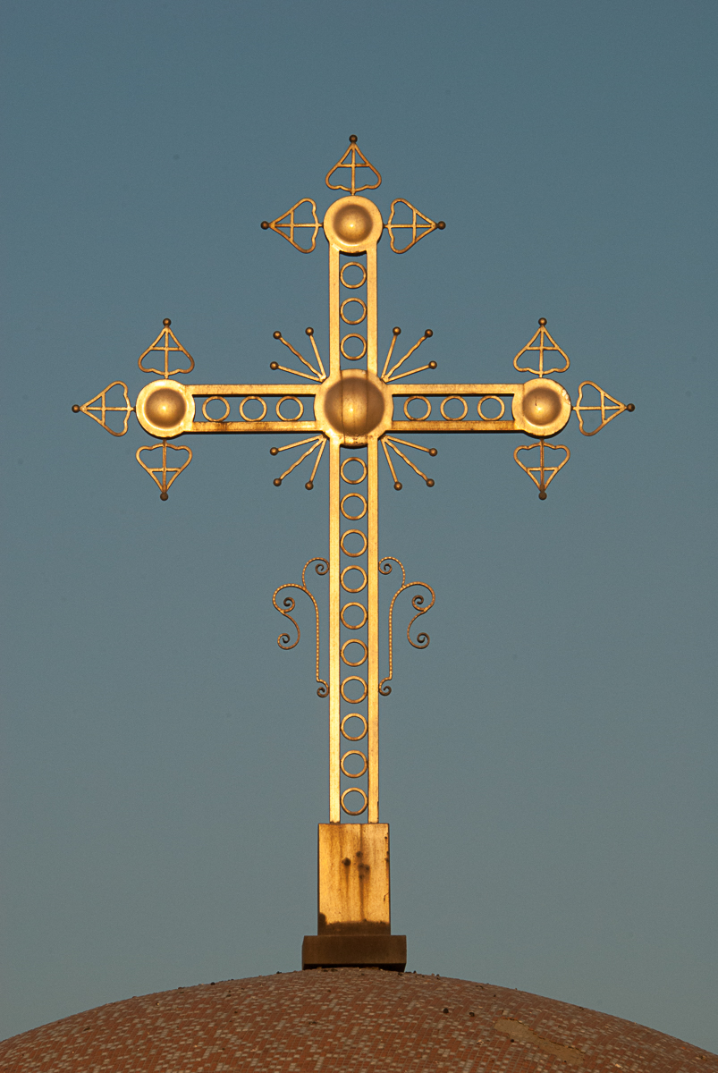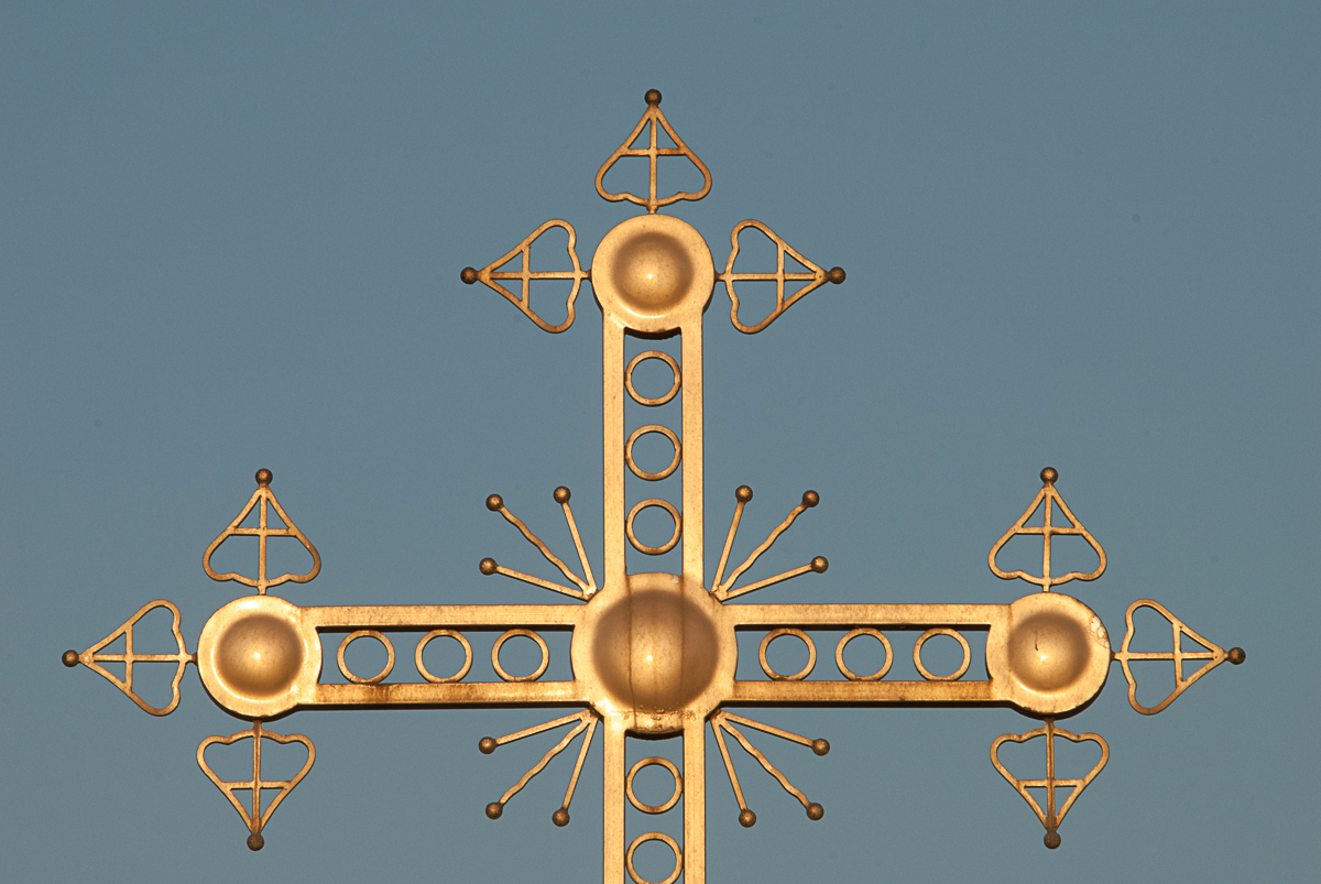 La porte d’entrée principale, à l’ouest, se situe dans l’axe de la nef. Des portes latérales se trouvent également au milieu des façades nord et sud. Au dessus de la porte ouest se trouve une tour clocher carrée. À l’est, au dessus du sanctuaire, l’église est surmontée d’un joli dôme surhaussé à tambour et fenêtres rectangulaires, recouvert de petits carreaux de céramiques, au sommet duquel se dresse une croix tréflée en métal doré.