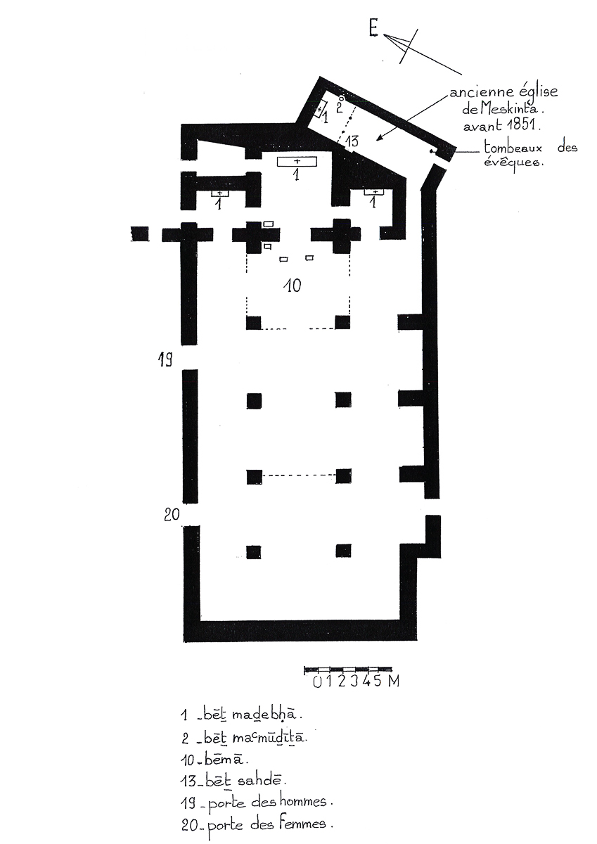 L’église Mart Meskinta d’avant 1851 est un petit édifice mononef de 10 mètres par 3, avec une entrée à l’ouest dans l’axe de la nef, au bout de laquelle se trouve l’autel et juste à sa droite une cuve baptismale. On y trouve aussi des tombeaux d’évêques.