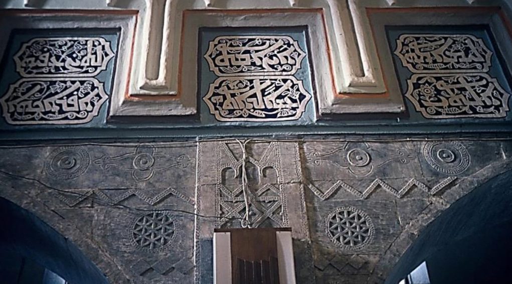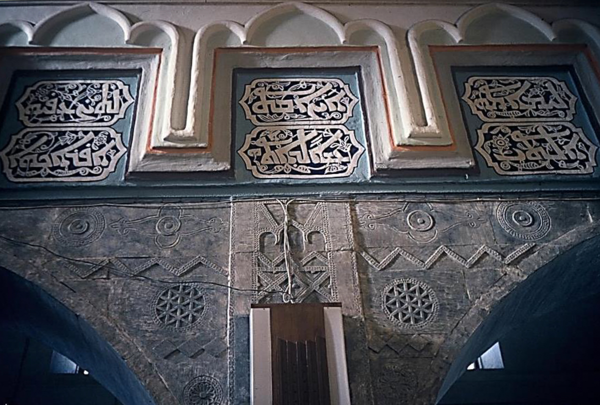 On y trouve aussi un élément décoratif unique[1] : ce sont des tableaux calligraphiques en langue arabe garsuni sculptés et peints, disposés en enfilade sur toute la longueur de la corniche au dessus des arches de la nef.