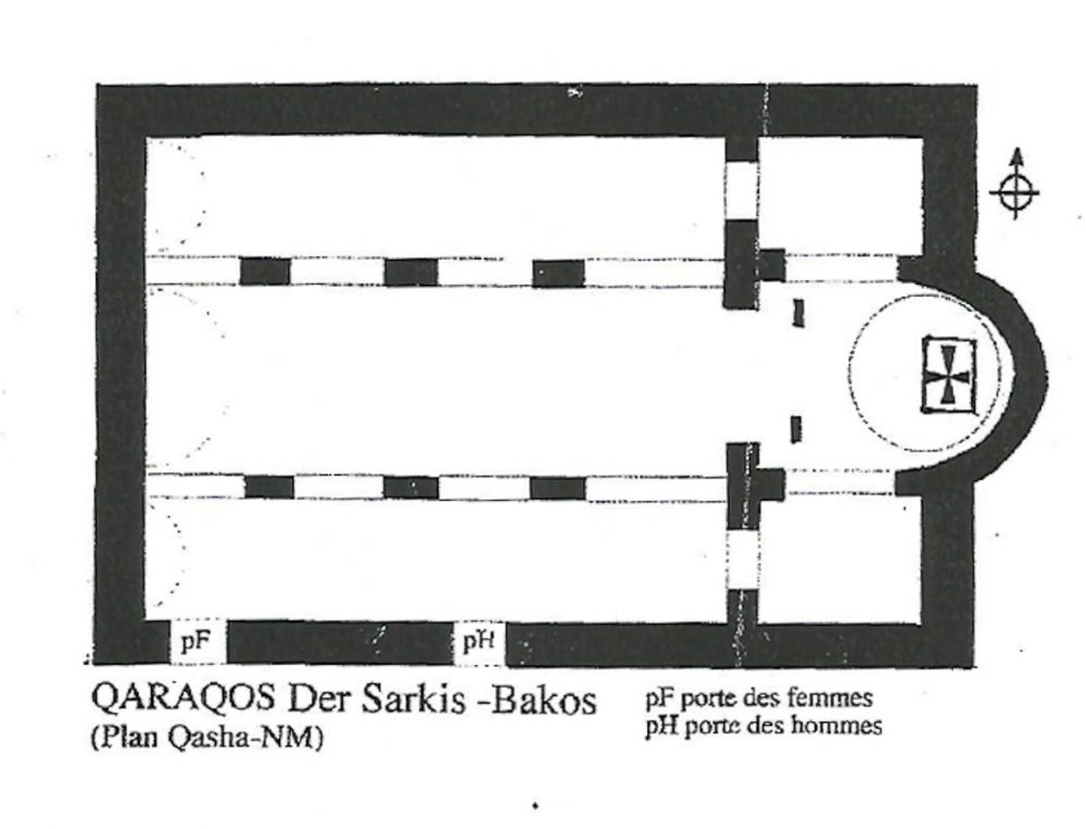 Plan de l’église des Saints Serge et Bacchus de Bakhdida (Qaraqosh), d’après Suhayll Qasha, modifié, 1982 © « Les églises et monastères du Kurdistan irakien à la veille et au lendemain de l’islam », thèse de doctorat de Narmen Ali Amen. Université de Saint Quentin en Yvelines. Mai 2001, p.189