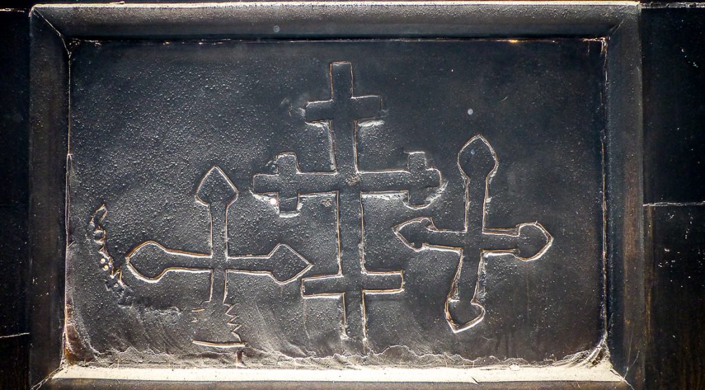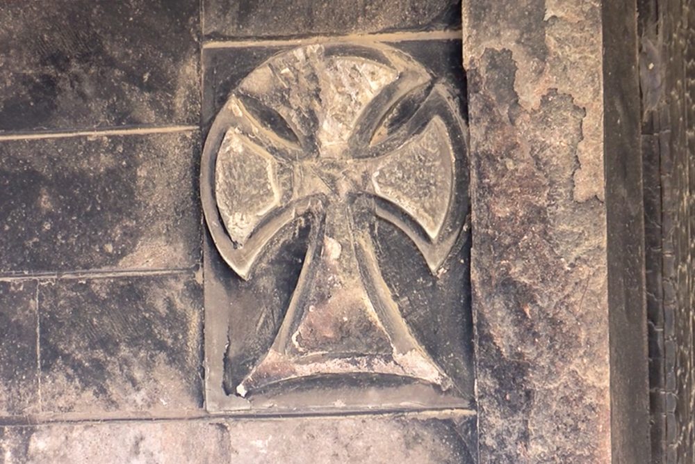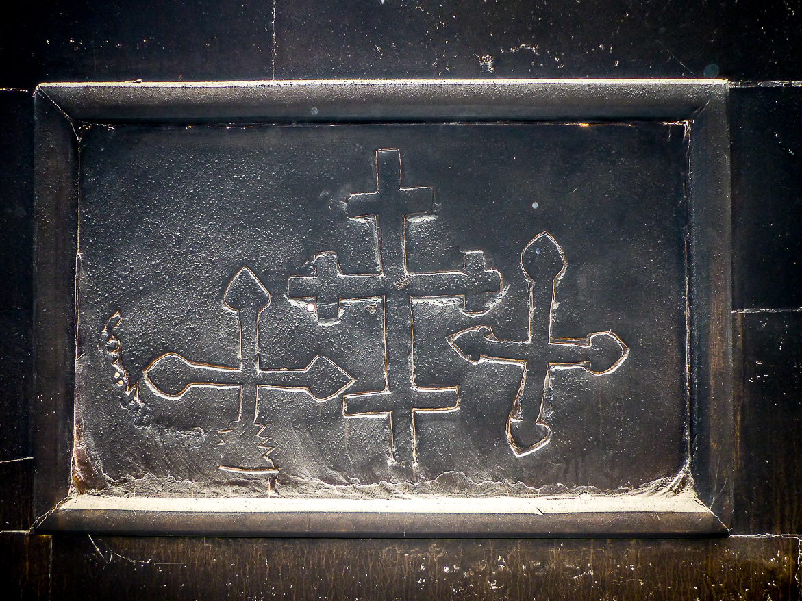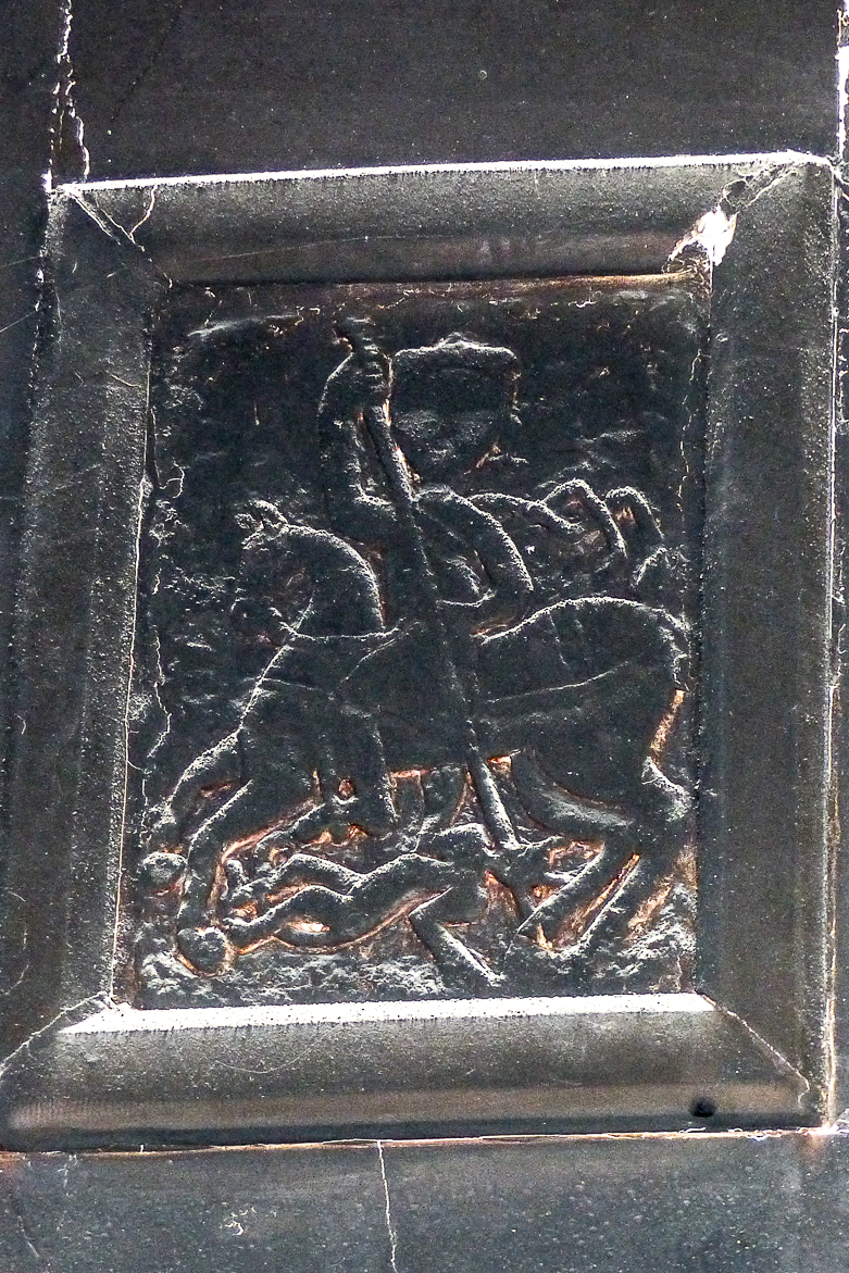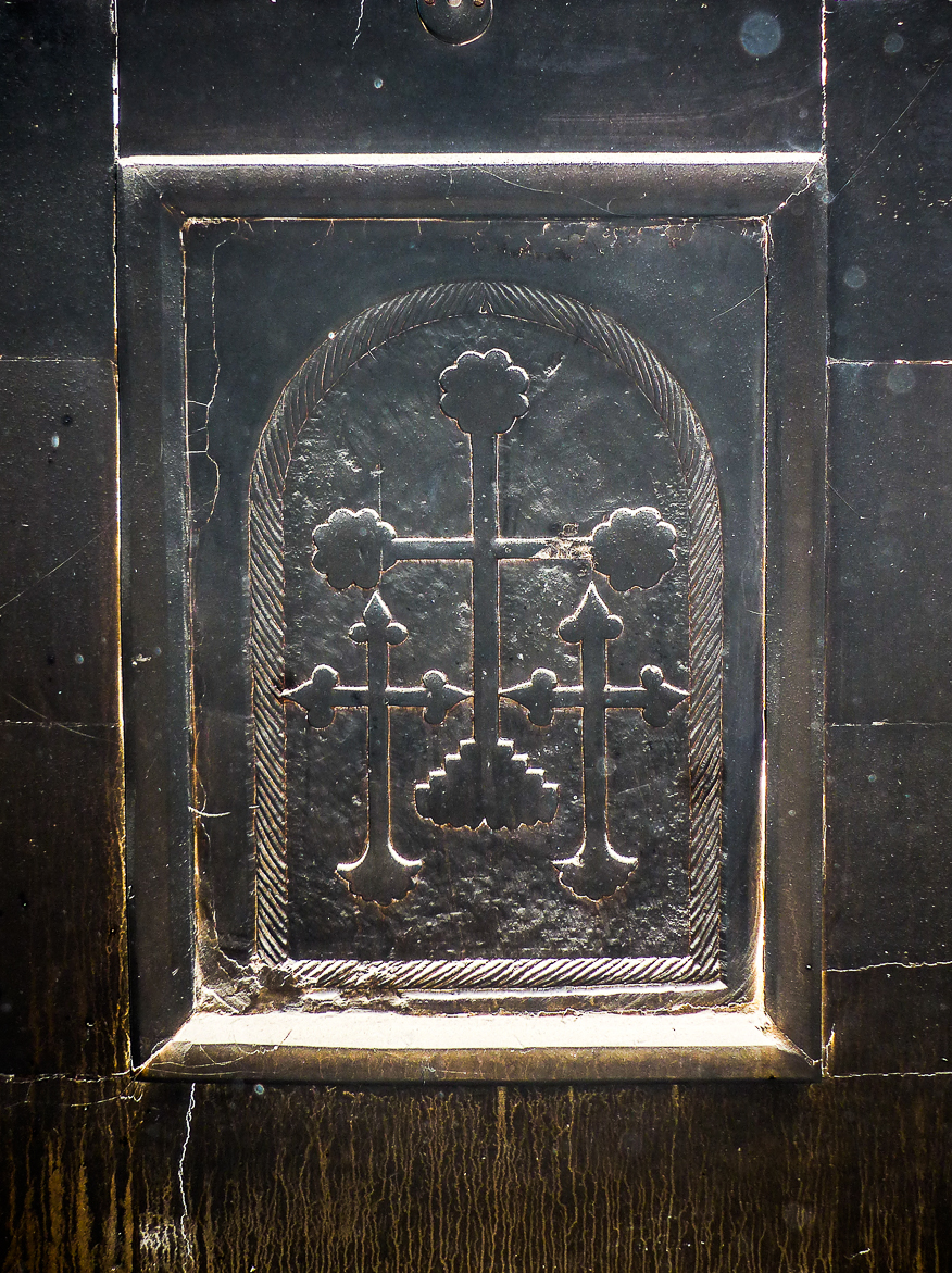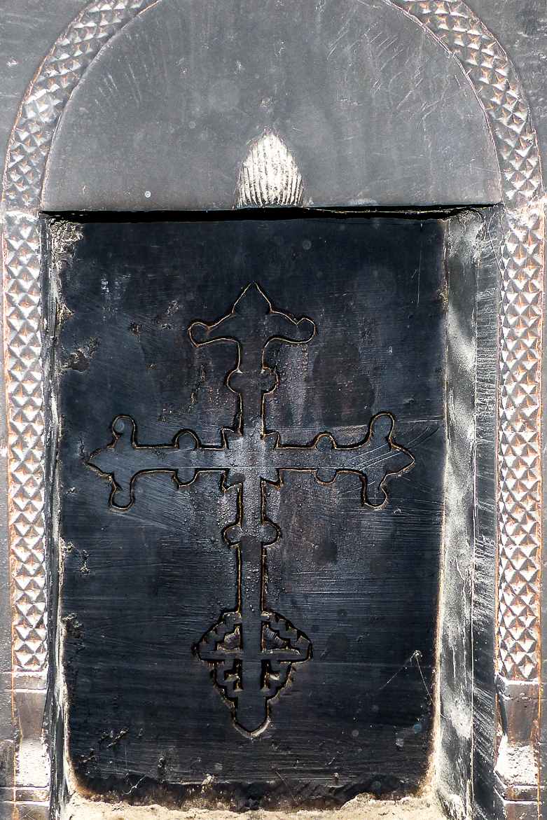 Par chance, la porte sainte sculptée de motifs anciens n’a fait l’objet d’aucune destruction. Tous les bas-reliefs sont en revanche recouverts d’une épaisse couche de suie, stigmate des incendies.