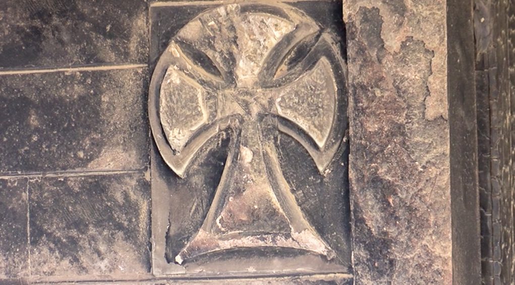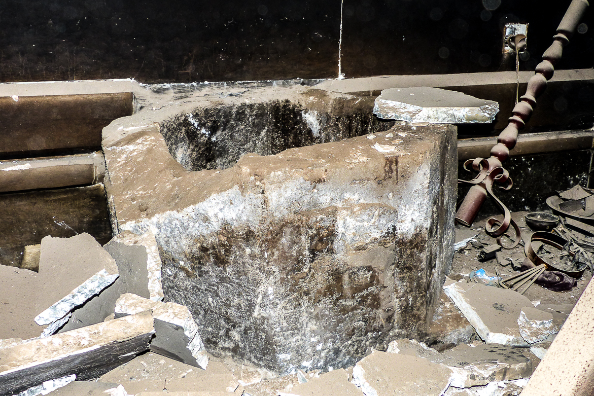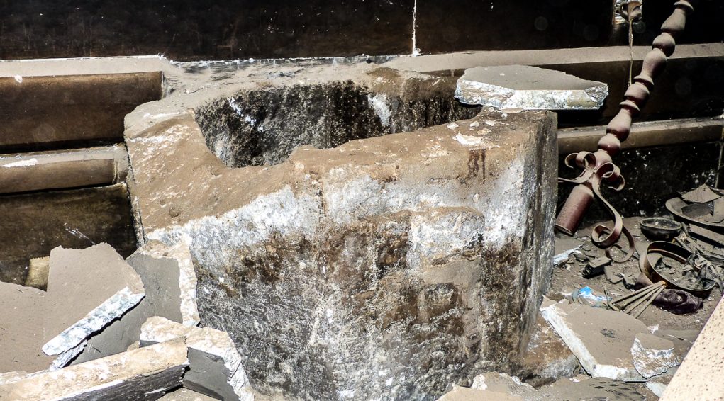 Dans le bas-côté droit, le pan de mur à droite de l’autel est partiellement détruit à l’endroit où étaient encastrées les plaques en céramique de couleur jaune représentant des croix (voir le chapitre précédent). Elles devaient encore sans doute gésir sous les décombres, au cours de la visite réalisée par MESOPOTAMIA[3] et KTO[4] en Janvier 2018.