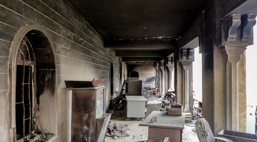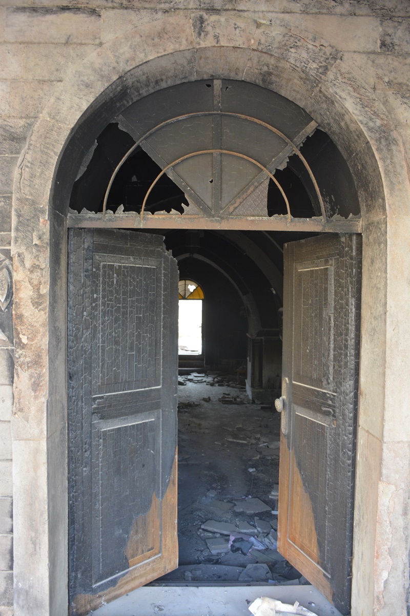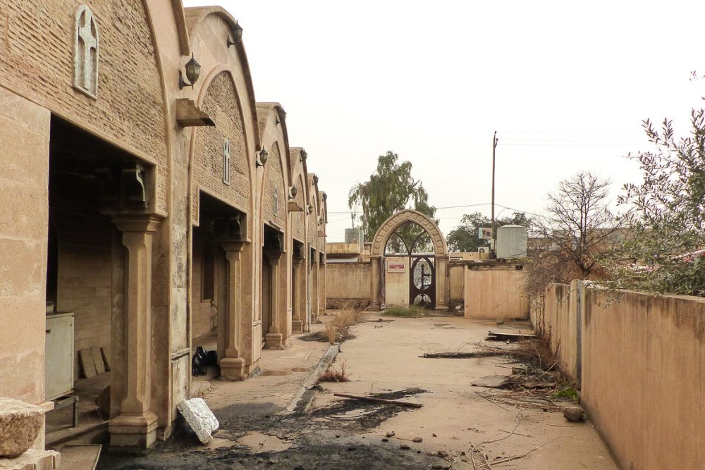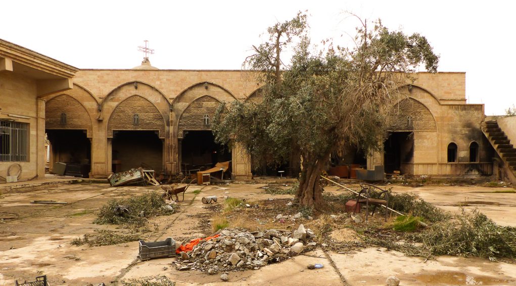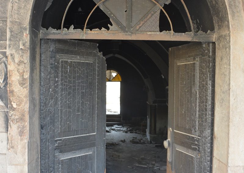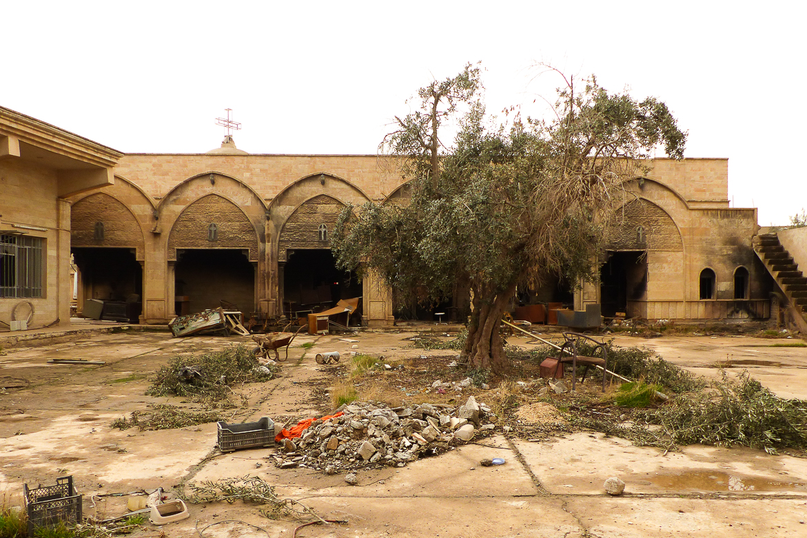 Au 23 juillet 2019, près de trois ans après la libération de la plaine de Ninive, l’église des Saints Serge et Bacchus n’a toujours pas été nettoyée ni même restaurée.