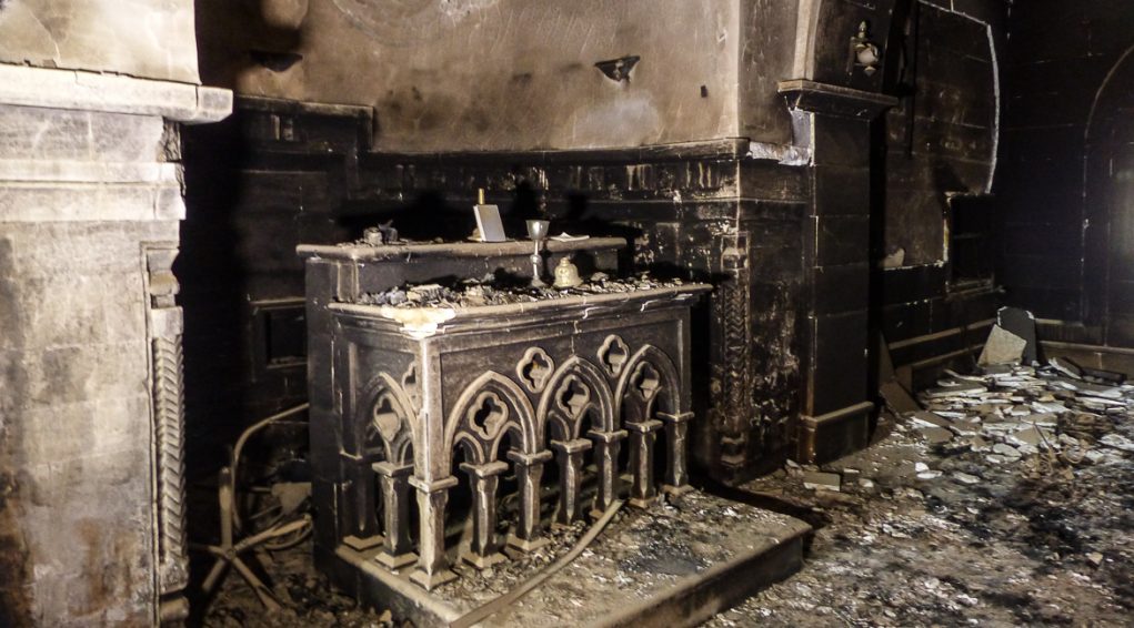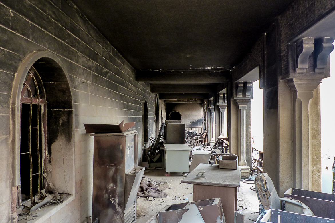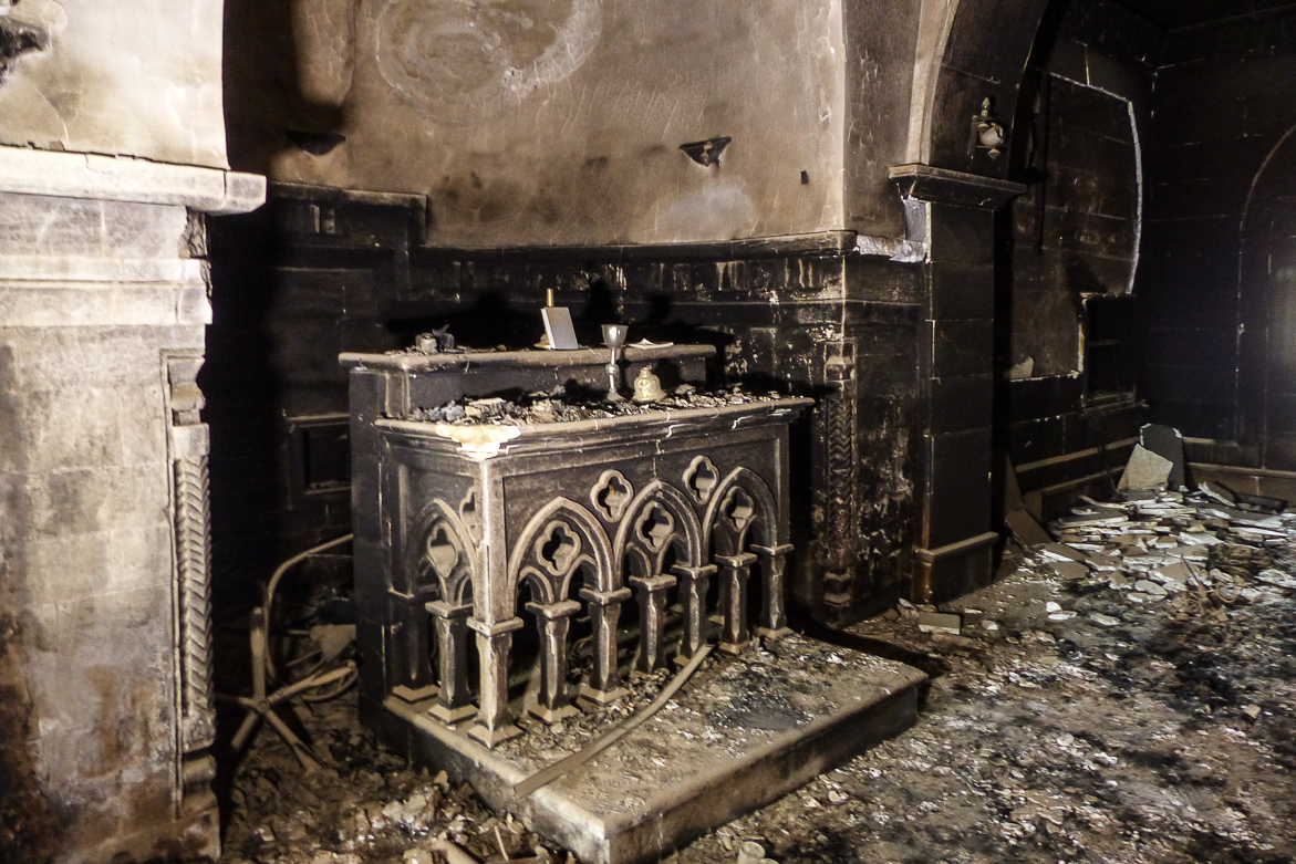 Après avoir descendu trois marches en marbre recouvertes de débris calcinés, l’église apparaît comme totalement noircie et très endommagée. Plusieurs incendies y ont probablement été allumés. Le marbre de parement a explosé çà et là sous l’effet de la chaleur. Des armoires de bureau en fer ont été jetées au sol, des sièges de bureau au métal déformé s’entassent avec des morceaux de claviers d’ordinateur fondus.