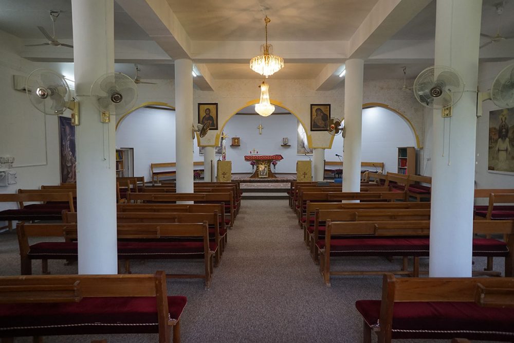 L’église proprement dite est un petit édifice en béton armé sans charme, dont les deux croix dressées sur le toit révèlent son caractère chrétien. Son architecture intérieure est celle d’une halle à trois nefs séparées par des piliers cylindriques. Le sanctuaire, à peine surélevé, est séparé de la nef par une porte à trois arches. Les fenêtres de l’église sont ornées de stores imprimés de motifs religieux.