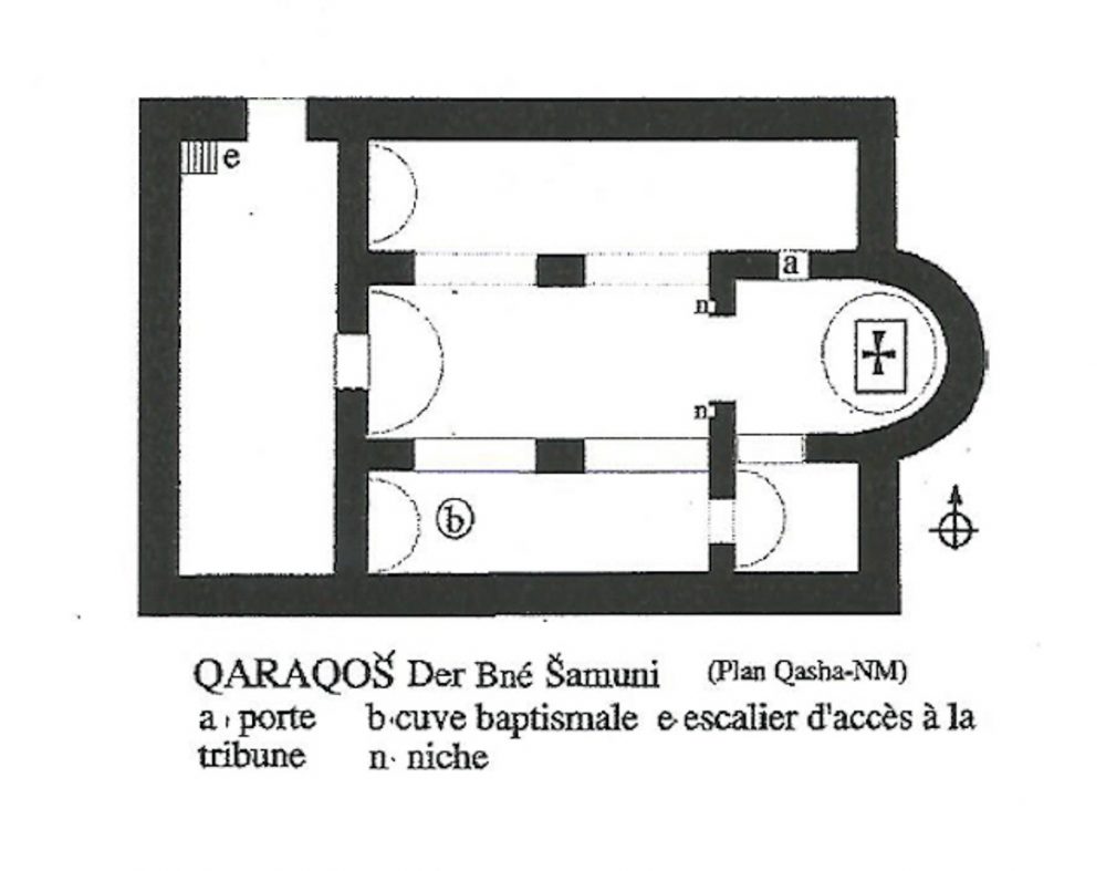 Plan de l’église Mart Schmouni de Bakhdida (Qaraqosh), d’après Suhayll Qasha, modifié, 1982 © « Les églises et monastères du Kurdistan irakien à la veille et au lendemain de l’islam », thèse de doctorat de Narmen Ali Amen. Université de Saint Quentin en Yvelines. Mai 2001, p.192
