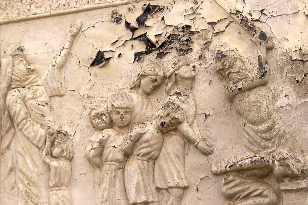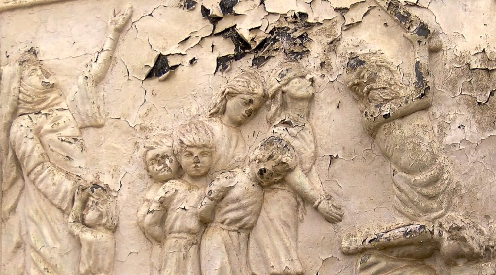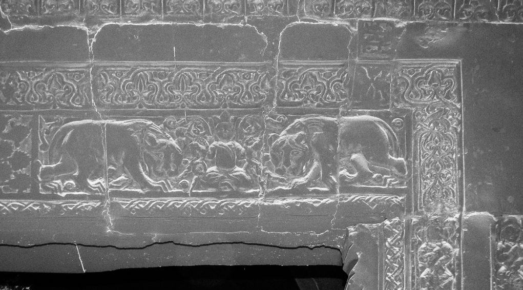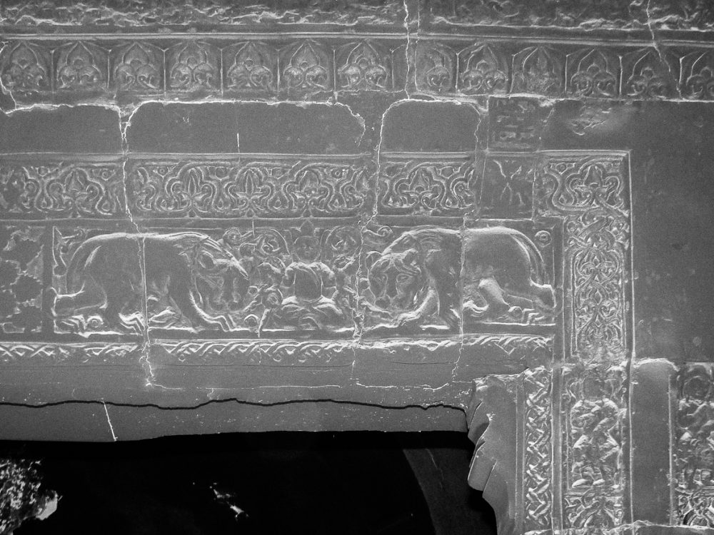 Le linteau et les montants de la porte royale de l’église Mart Schmouni sont richement ciselés de bas-reliefs du XIIe siècle représentant notamment les enfants de Mart Schmouni, les Maccabées. Cette frise n’a heureusement pas été martelée mais « seulement » noircie par la fumée. Les visages et les vêtements de ces figurines ont le type mongol, révélant ainsi certaines des sources d’influence politiques et culturelles de l’art chrétien mésopotamien au XIIe siècle. Un bas-relief représente également un homme en tailleur, les yeux fermés tenant de part et d’autre deux lions en laisse. Ce « Daniel aux lions » est une représentation typique de la sagesse que l’homme peut atteindre.