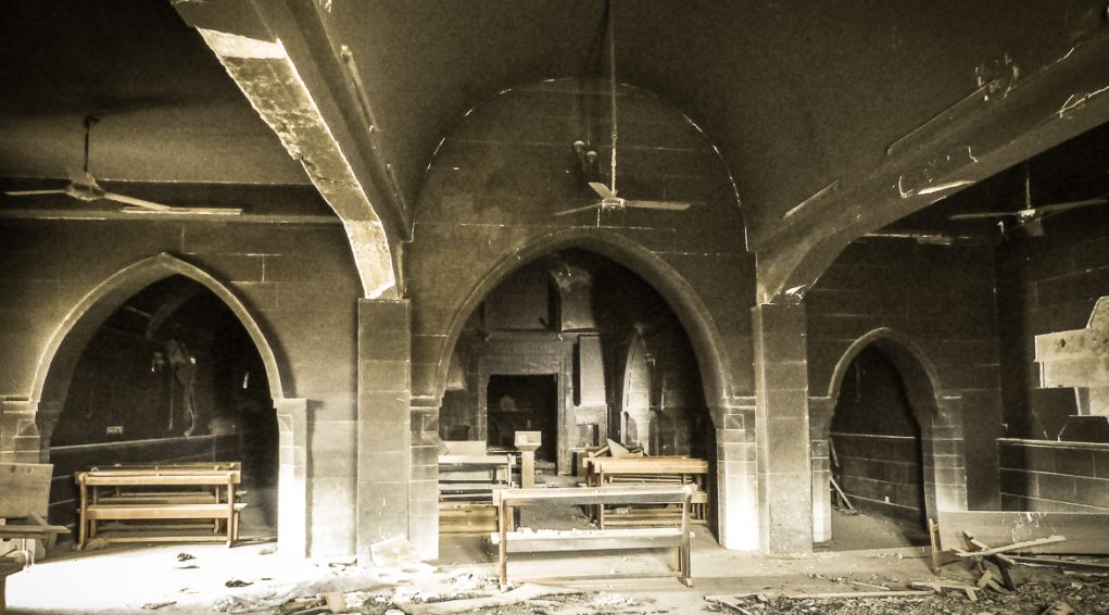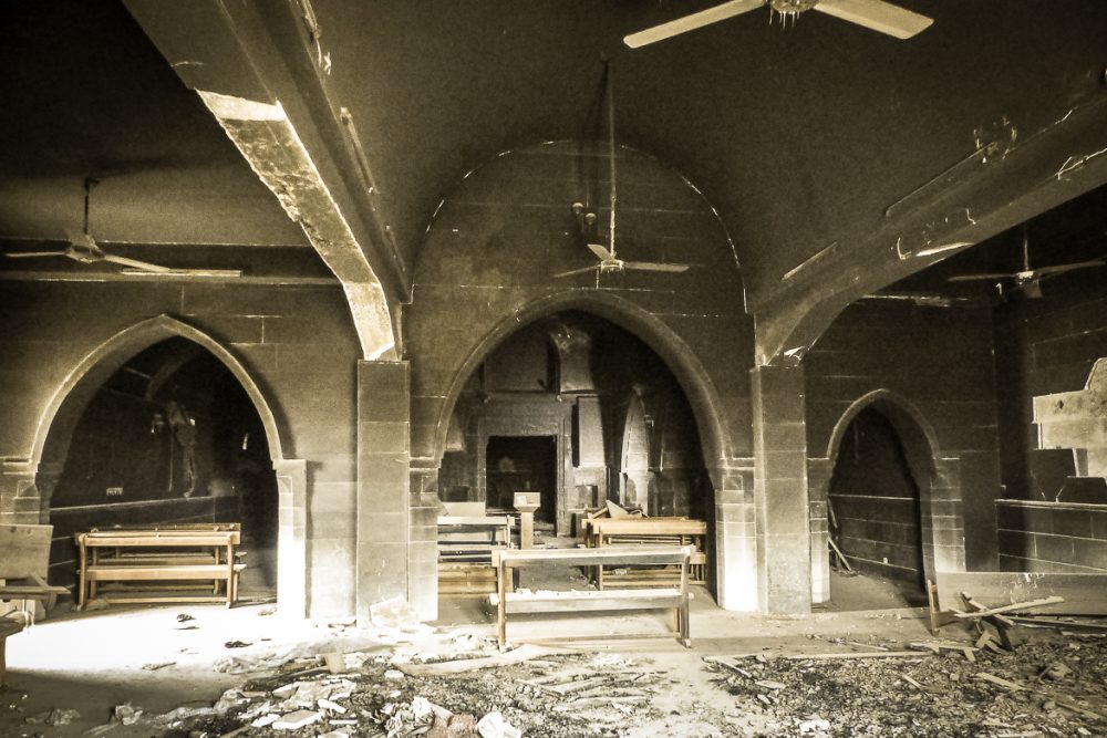 En pénétrant dans l’église, on est avant tout saisi par la noirceur des lieux. En ce début d’année 2018, on pouvait encore apercevoir face à l’entrée, mais légèrement sur la droite (le chœur se trouvant sur la gauche), les cendres de deux gros incendies criminels allumés par Daesh avec une partie des bancs de l’église. Il fallait encore à cette date un éclairage d’appoint pour évoluer dans cette église souillée et noircie par la suie.