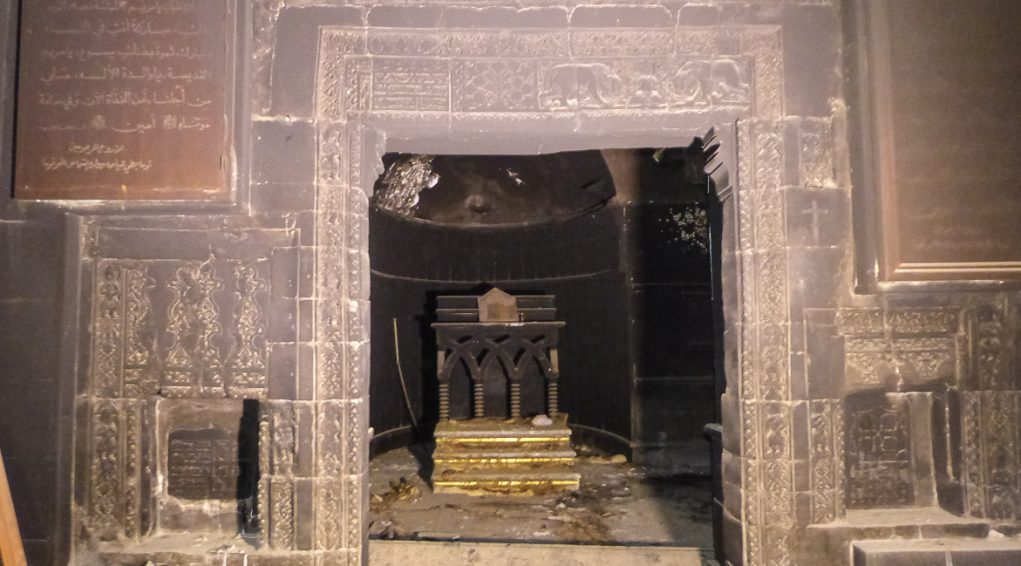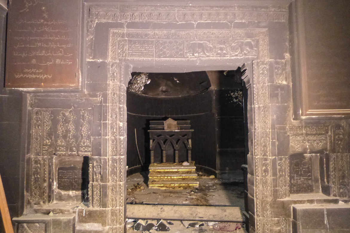 Une fois passée la porte royale, sous le dôme faiblement éclairé se trouve le maître-autel à degrés et en pierres. Là aussi, le sol était encore recouvert des cendres d’un autre incendie criminel, lors de la visite de l’équipe de MESOPOTAMIA en janvier 2018.
