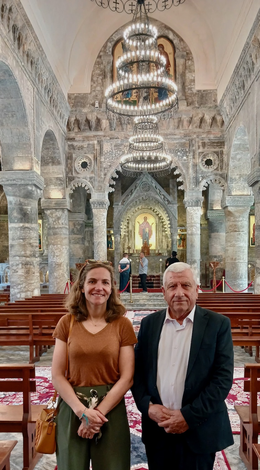 Reconstruction achevée de la cathédrale Al Tahira. Yohanna Towaya, administrateur de Hammurabi avec Marie-Ange Denoyel, présidente de Mesopotamia