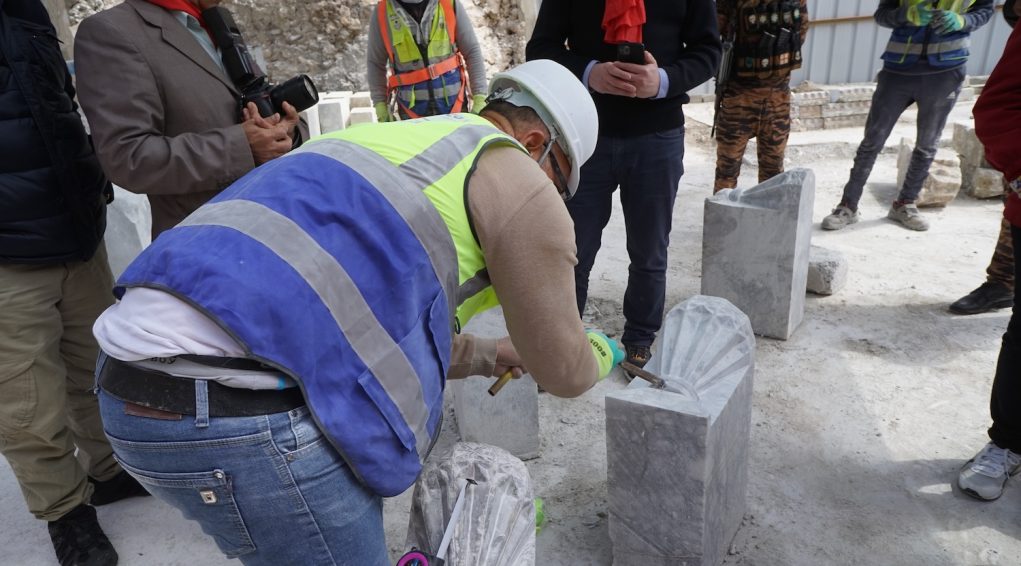 Taille des éléments décoratifs de la nouvelle cathédrale Al Tahira de Mossoul