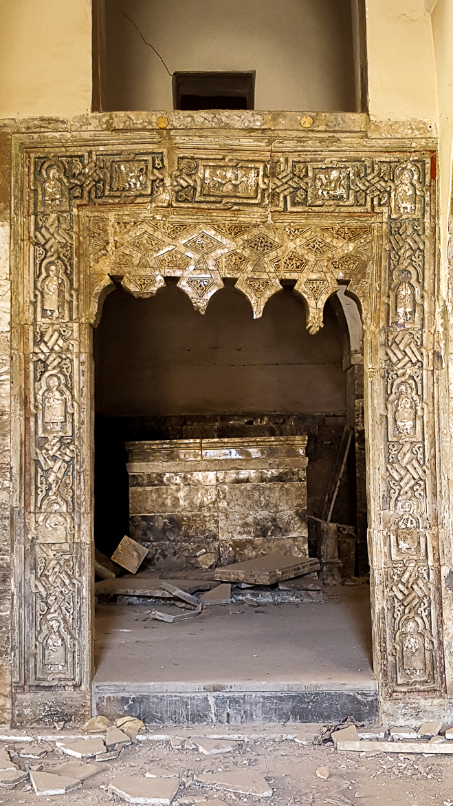 Ce qui rend cette église ancienne admirable, outre son histoire, c’est sa magnifique porte royale en marbre de Mossoul, dont l’encadrement est sculpté de bas-reliefs représentant les douze apôtres entourant le Christ. Cette frise, aux motifs et portraits entrelacés et dont les visages avaient une apparence asiatique, a été dégradée par les assaillants iconoclastes de daesh. Tous les visages ont été burinés. Cette porte royale fut reculée de quelques mètres en 1848 pour être alignée sur le sanctuaire de la nouvelle église Mar Touma, jumelée à l’ancienne sur son côté sud. Sur le pilier gauche contre lequel était autrefois adossée cette porte royale se trouve aujourd’hui les reliques de Mar Théodoros. Elles « furent installées solennellement au XVIIe siècle dans le pilier de la porte des douze apôtres et présentées à la dévotion des fidèles[3] ».