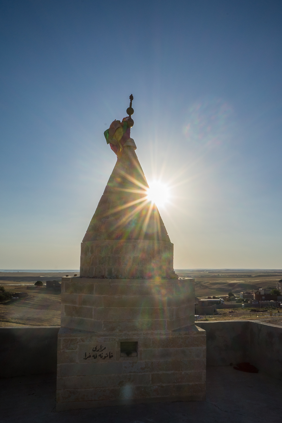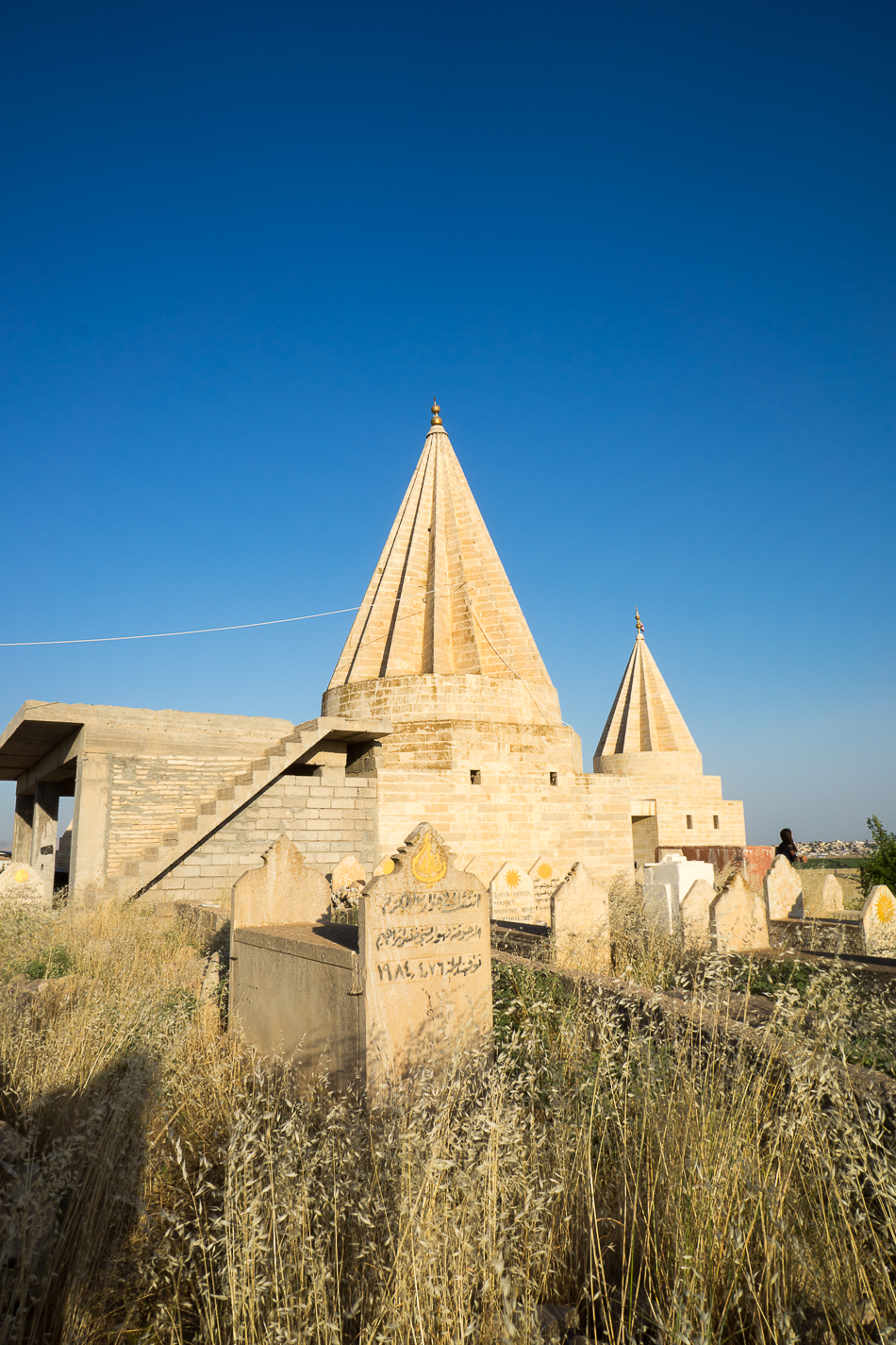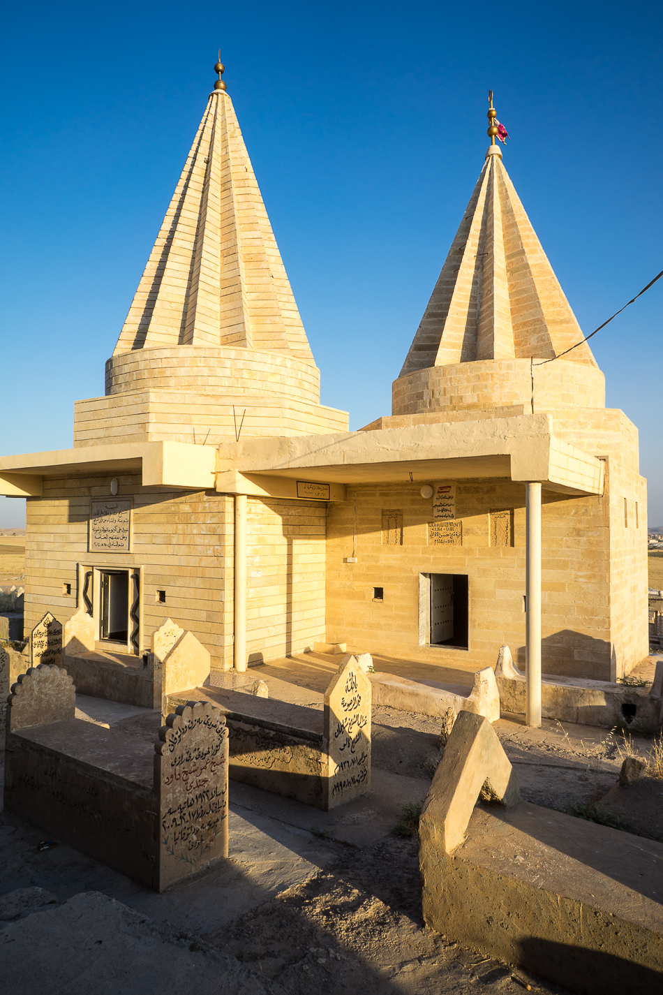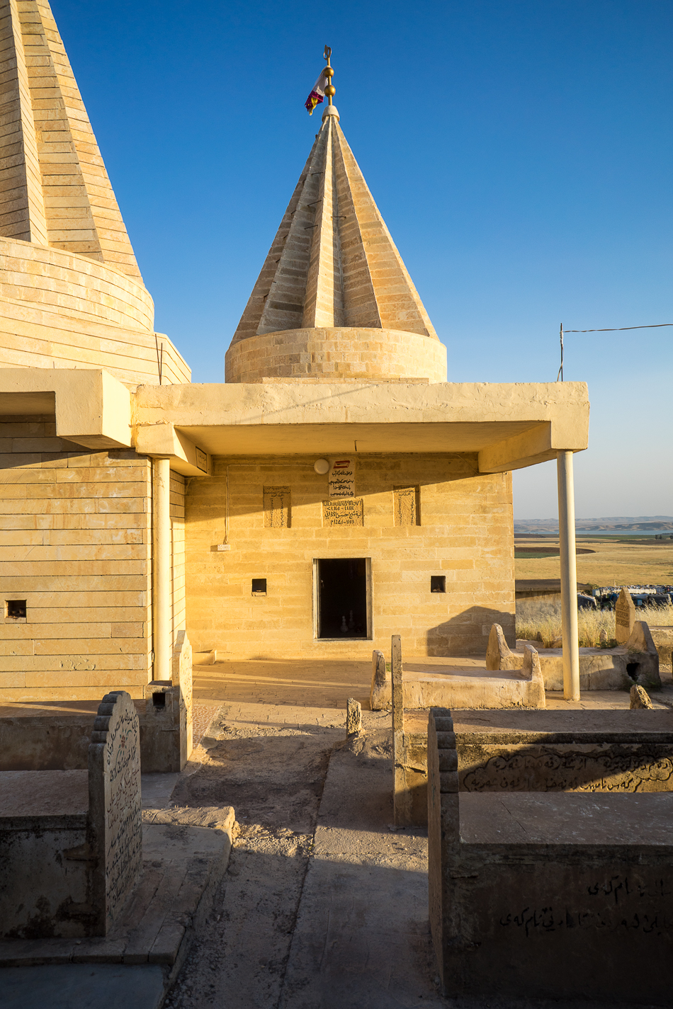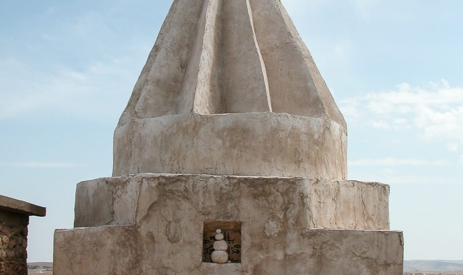 Le mausolée à dôme conique et à rayons est un monument emblématique de l’art sacré yézidi. D’une grande sobriété architecturale et ornementale, ce type d’édifice est fondé sur une structure cubique qui contient la sépulture ou le cénotaphe, couverte par une dalle que porte un tambour au dessus duquel se dresse un dôme conique à multiples arêtes. Cette voûte symbolise les rayons du soleil qui illuminent la terre et l’humanité.