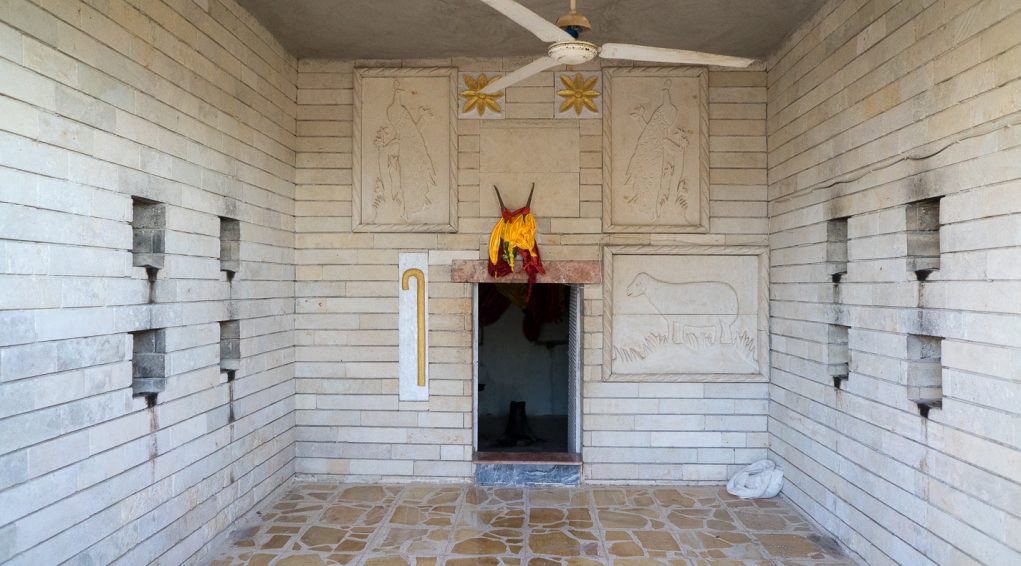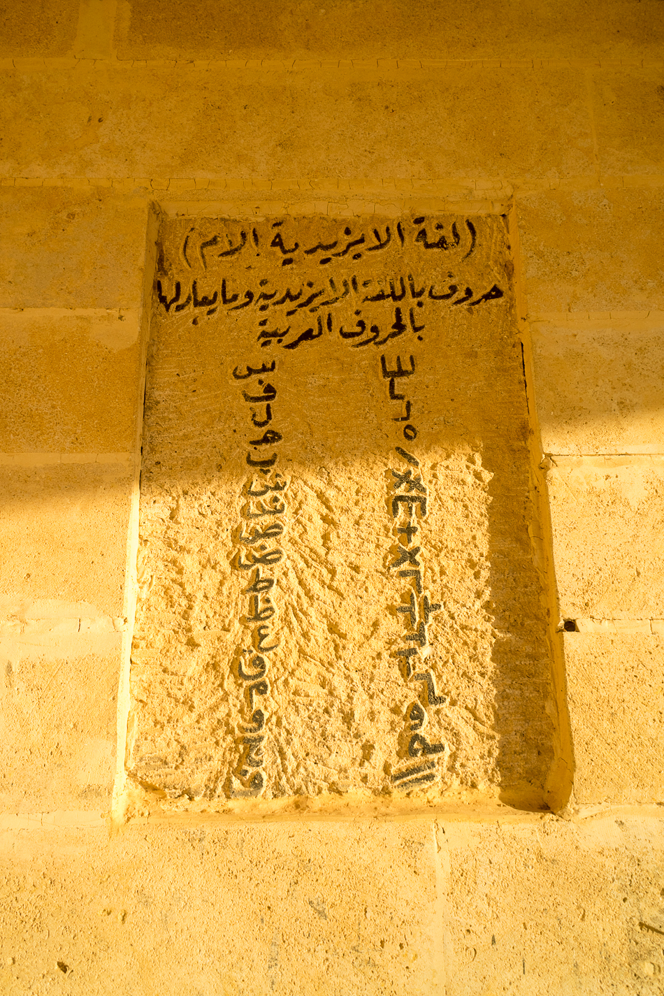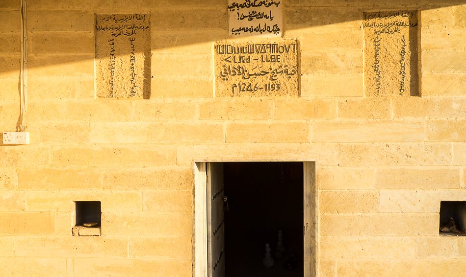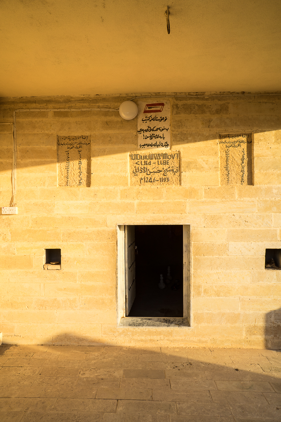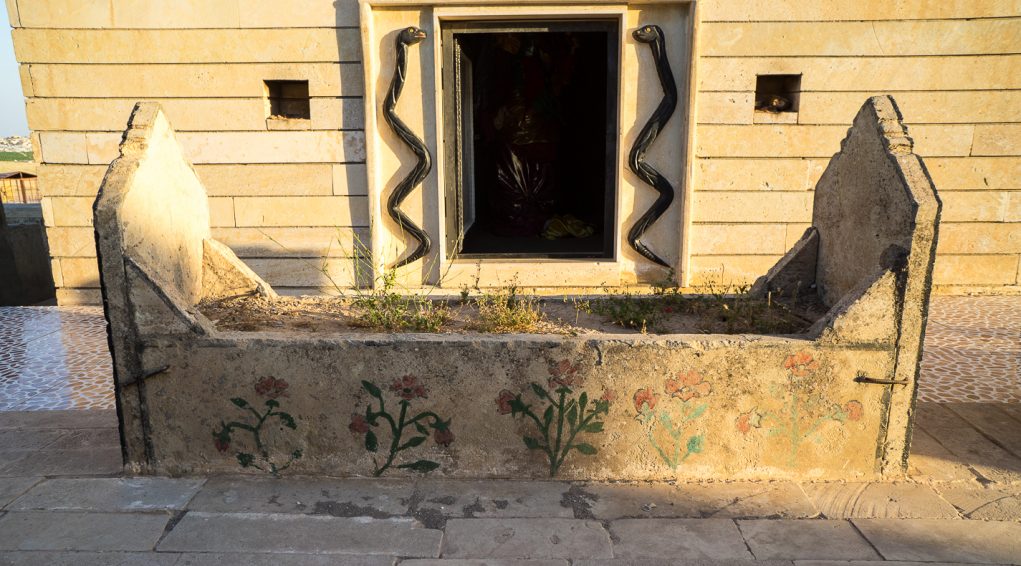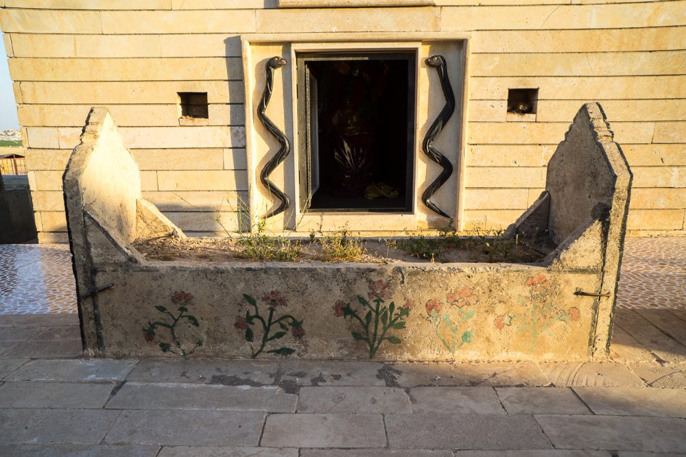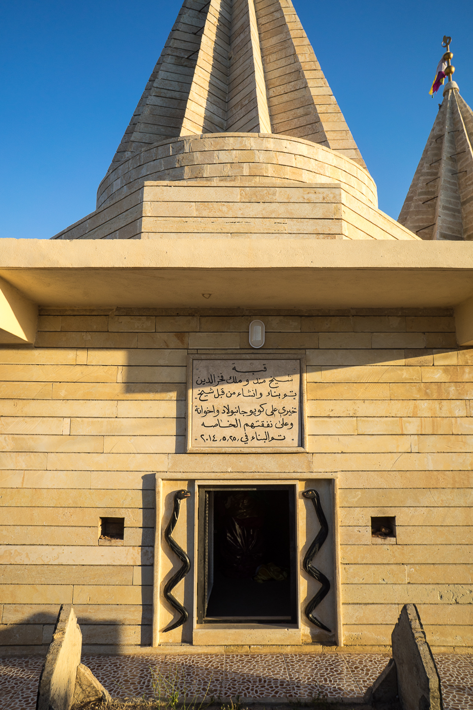 L’espace sacré de tout mausolée yézidi inclut la dalle qui le précède ou qui l’entoure. C’est pourquoi tout visiteur et tout pèlerin doit y être déchaussé.