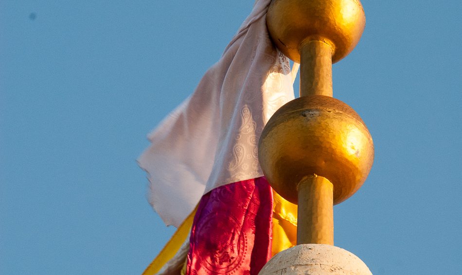 La pointe de ce dôme est systématiquement rehaussée d’une flèche de bronze, formée d’une ou plusieurs boules, surmontée d’un anneau, d’un croissant de lune, d’un astre voire d’une main, où sont nouées des étoffes de couleurs. La flèche représenterait le monde cosmique, les planètes, le soleil et les étoiles créés par Dieu. Les étoffes de couleur figureraient celles de l’arc en ciel[1].