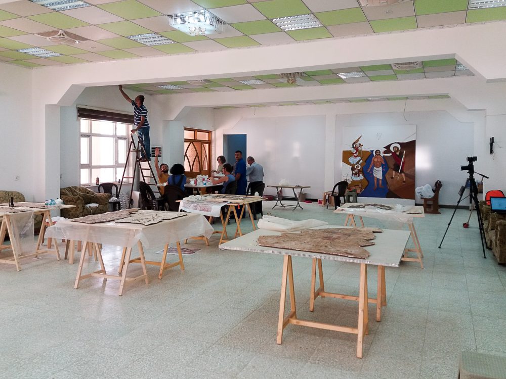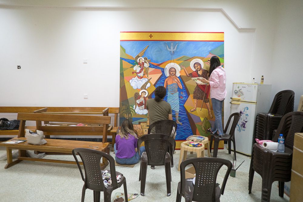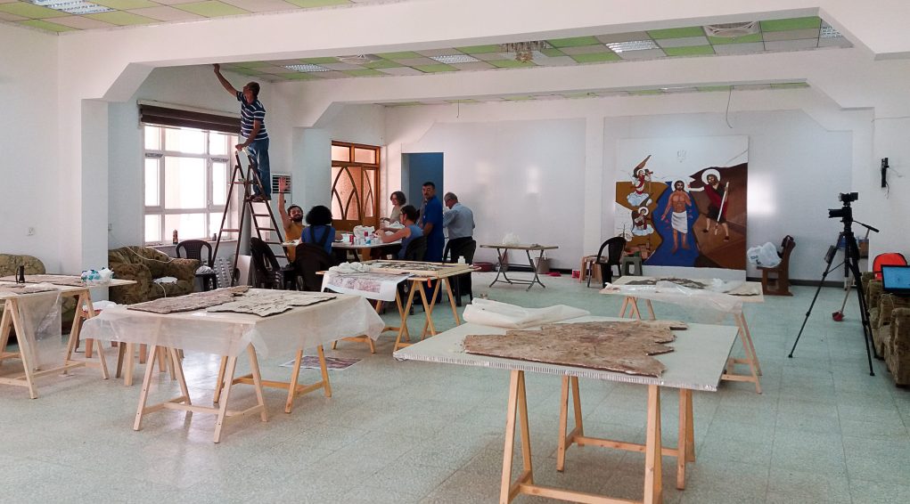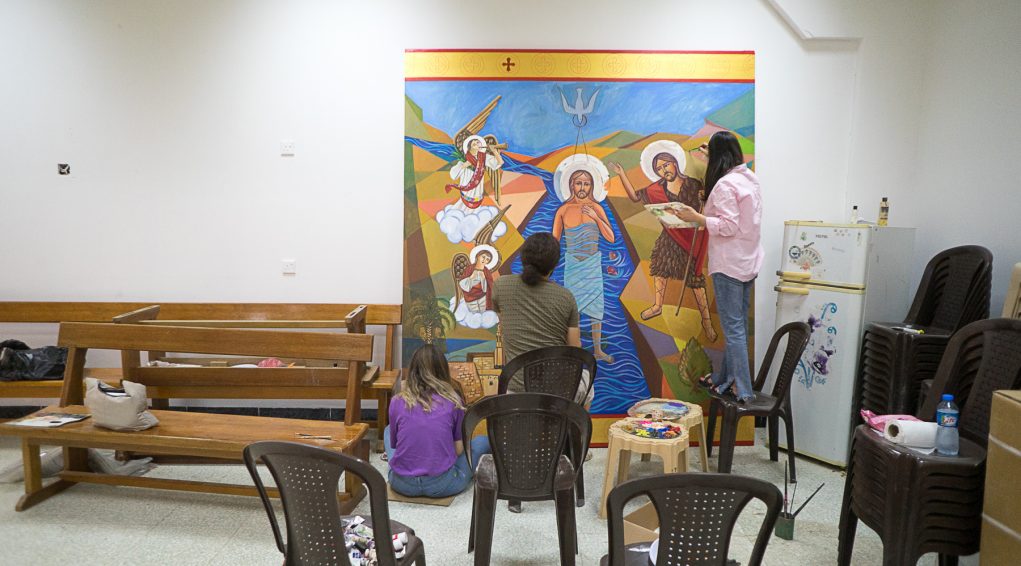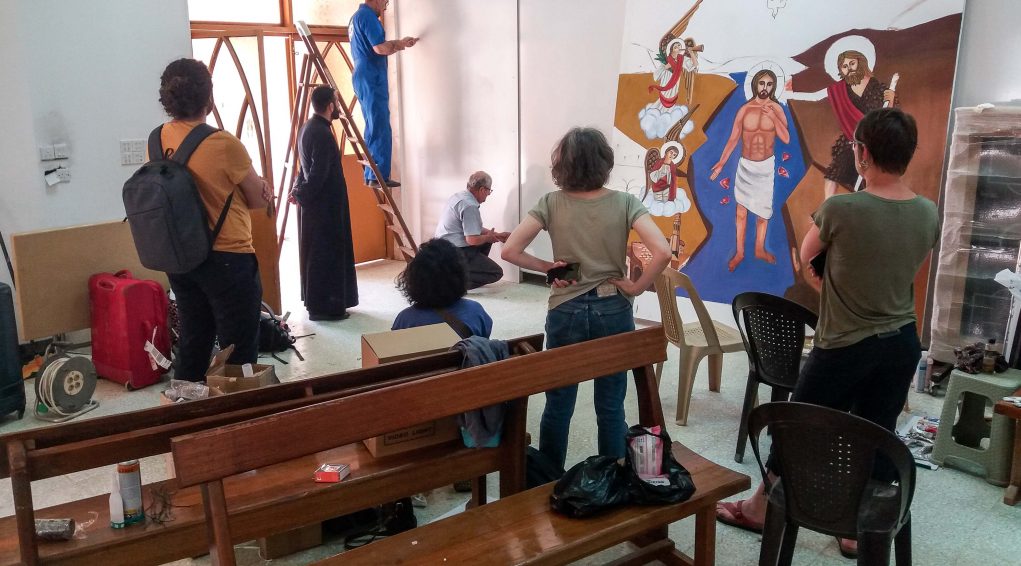 Géraldine Fray, l’une de nos trois restauratrices, vous expliquera toutes les étapes ainsi que les difficultés que notre équipe a surmontées avec succès pour accrocher la peinture murale dans le sanctuaire de la nouvelle église. Vous allez aussi faire la connaissance de Nenous Thabet, qui vous présentera la nouvelle peinture du baptême du Christ, réalisée avec trois étudiantes de l’école des Beaux arts de l’université de Mossoul, sous la direction de Monsieur Ibrahim Lallo.