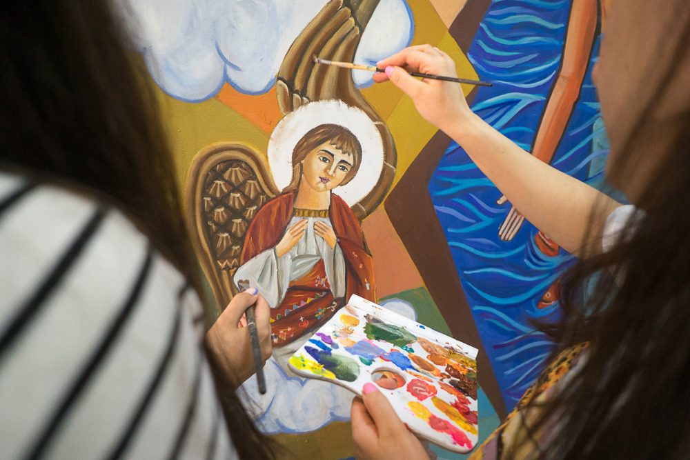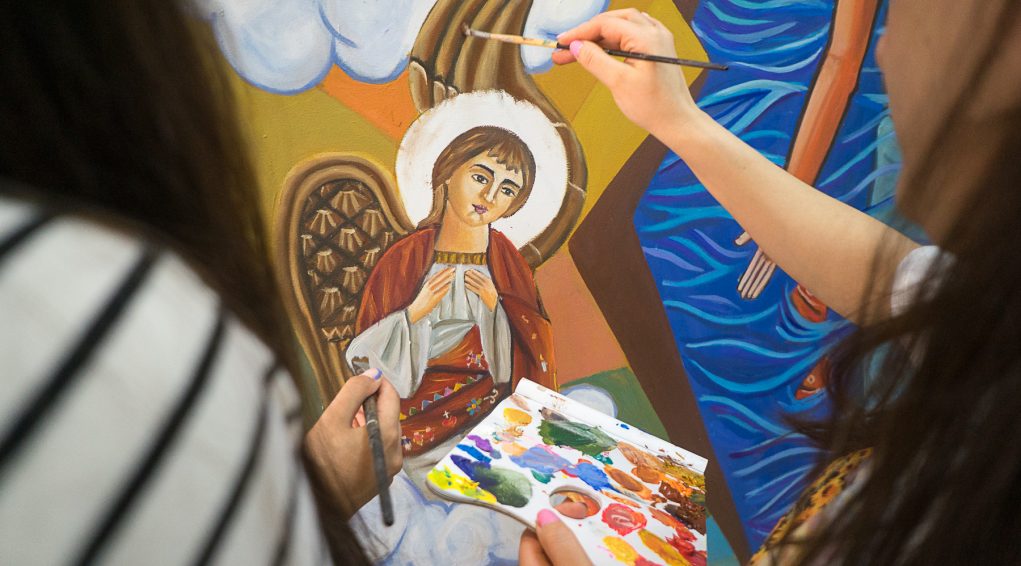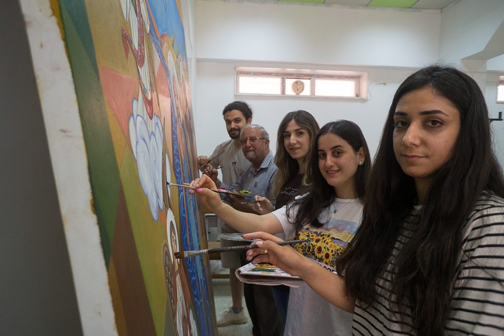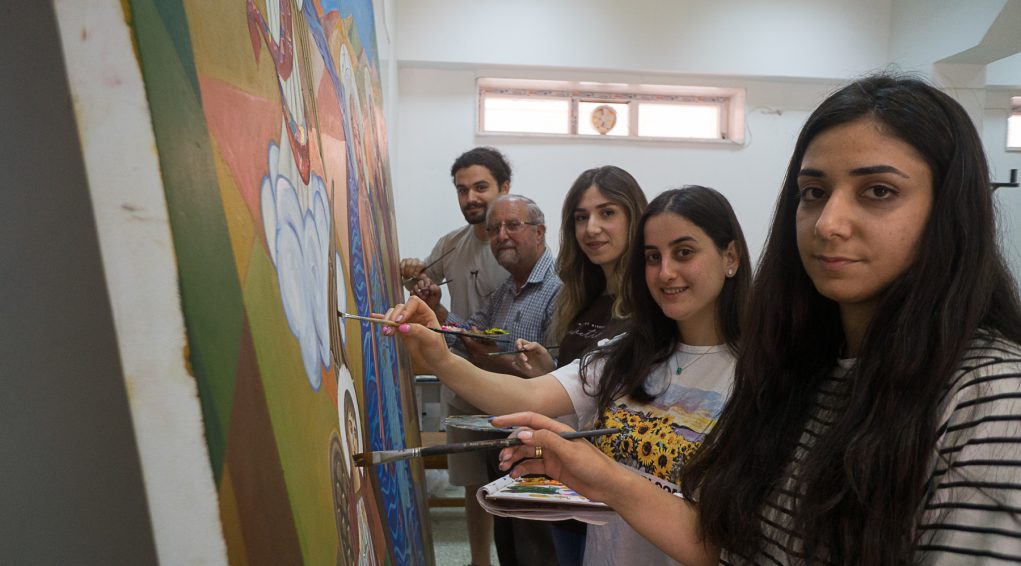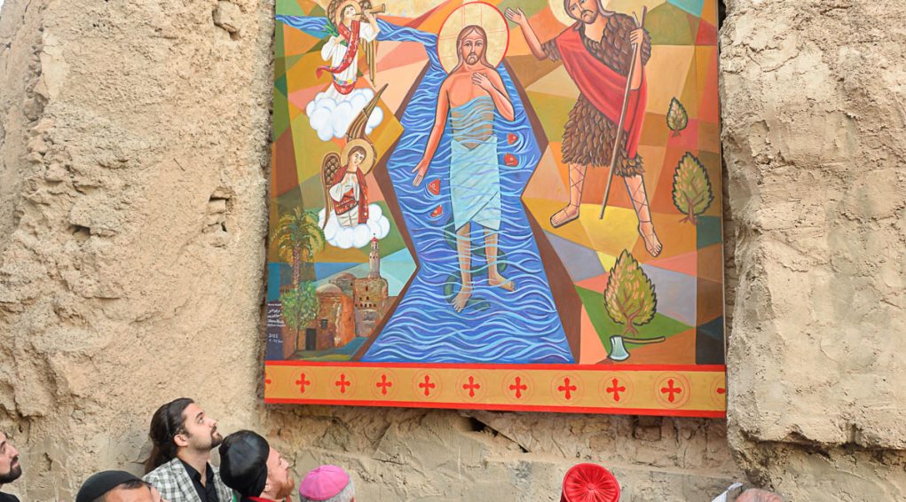 Géraldine Fray, l’une de nos trois restauratrices, vous expliquera toutes les étapes ainsi que les difficultés que notre équipe a surmontées avec succès pour accrocher la peinture murale dans le sanctuaire de la nouvelle église. Vous allez aussi faire la connaissance de Nenous Thabet, qui vous présentera la nouvelle peinture du baptême du Christ, réalisée avec trois étudiantes de l’école des Beaux arts de l’université de Mossoul, sous la direction de Monsieur Ibrahim Lallo.