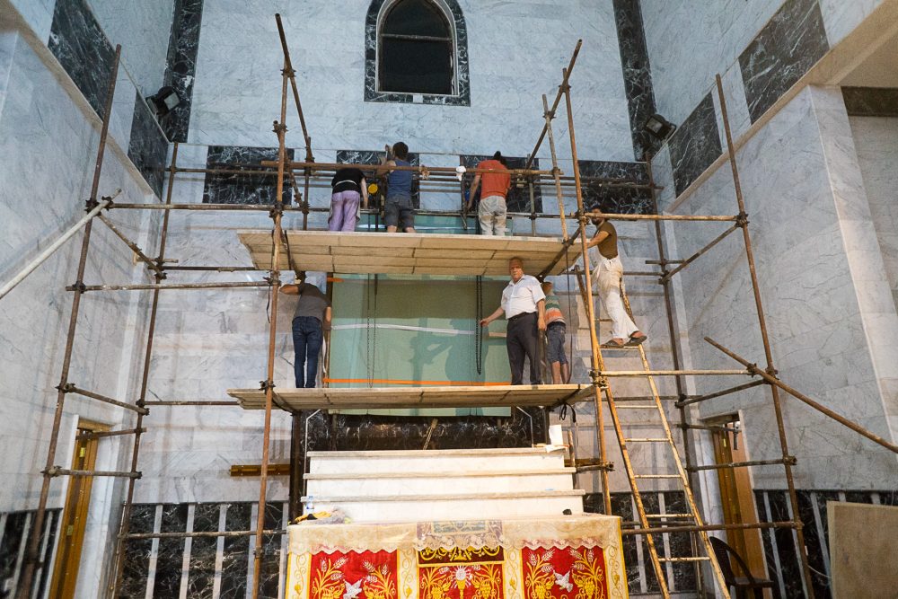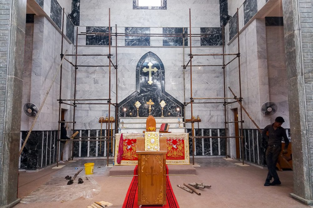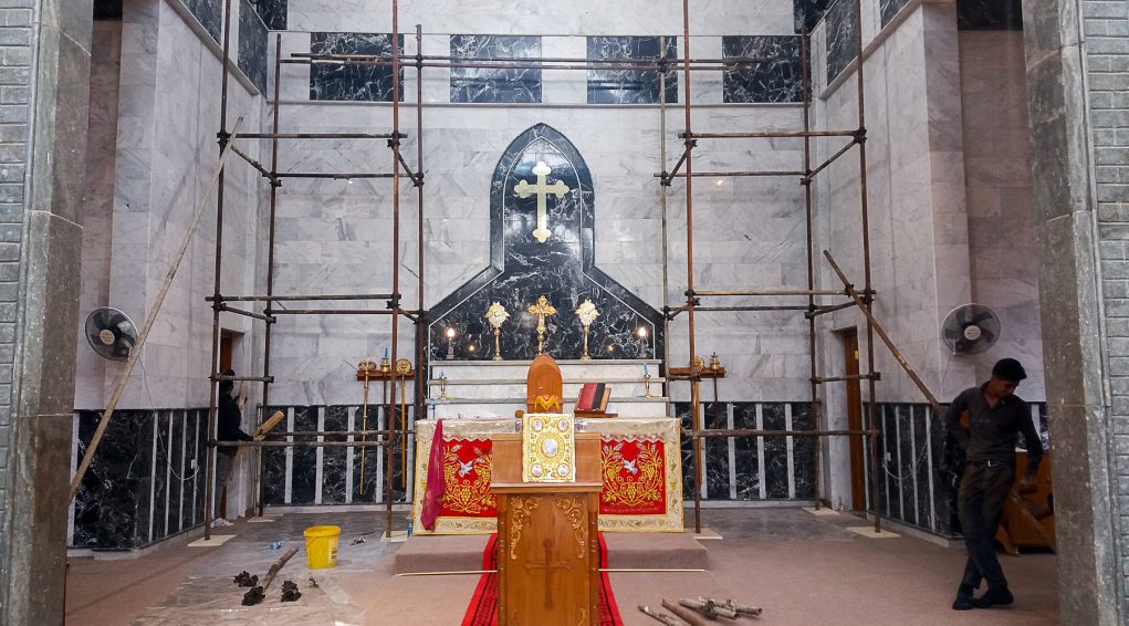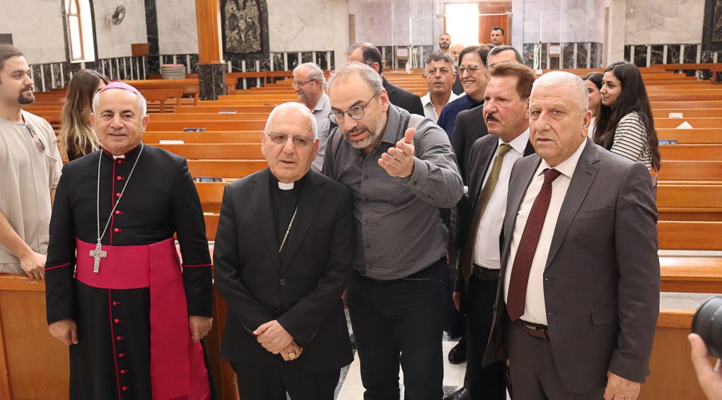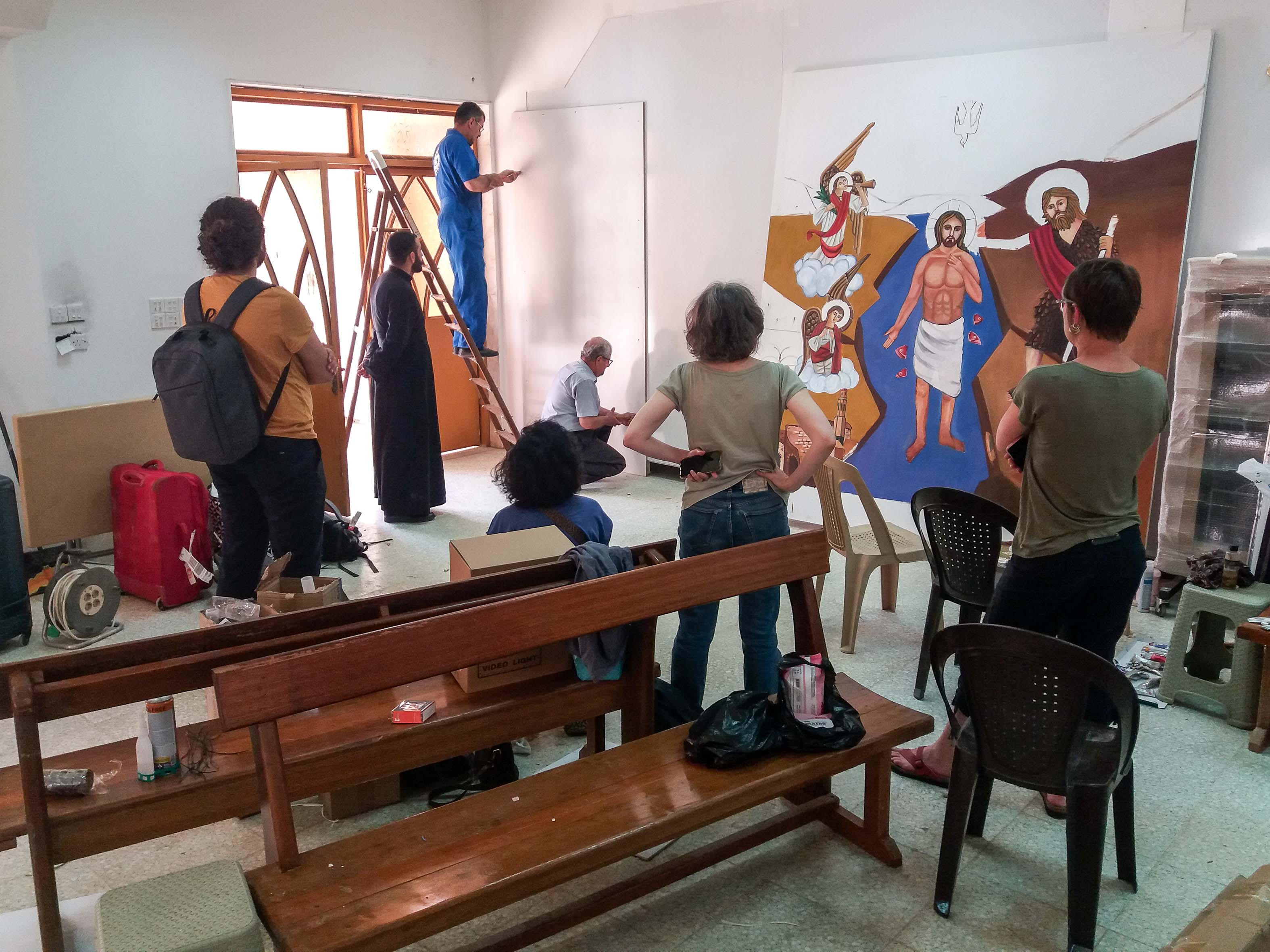 Nous nous sommes ensuite rendus dans la nouvelle église Mar Guorguis afin d’échanger avec Monseigneur Nicodemus sur le lieu d’accrochage et d’exposition de la peinture restaurée.