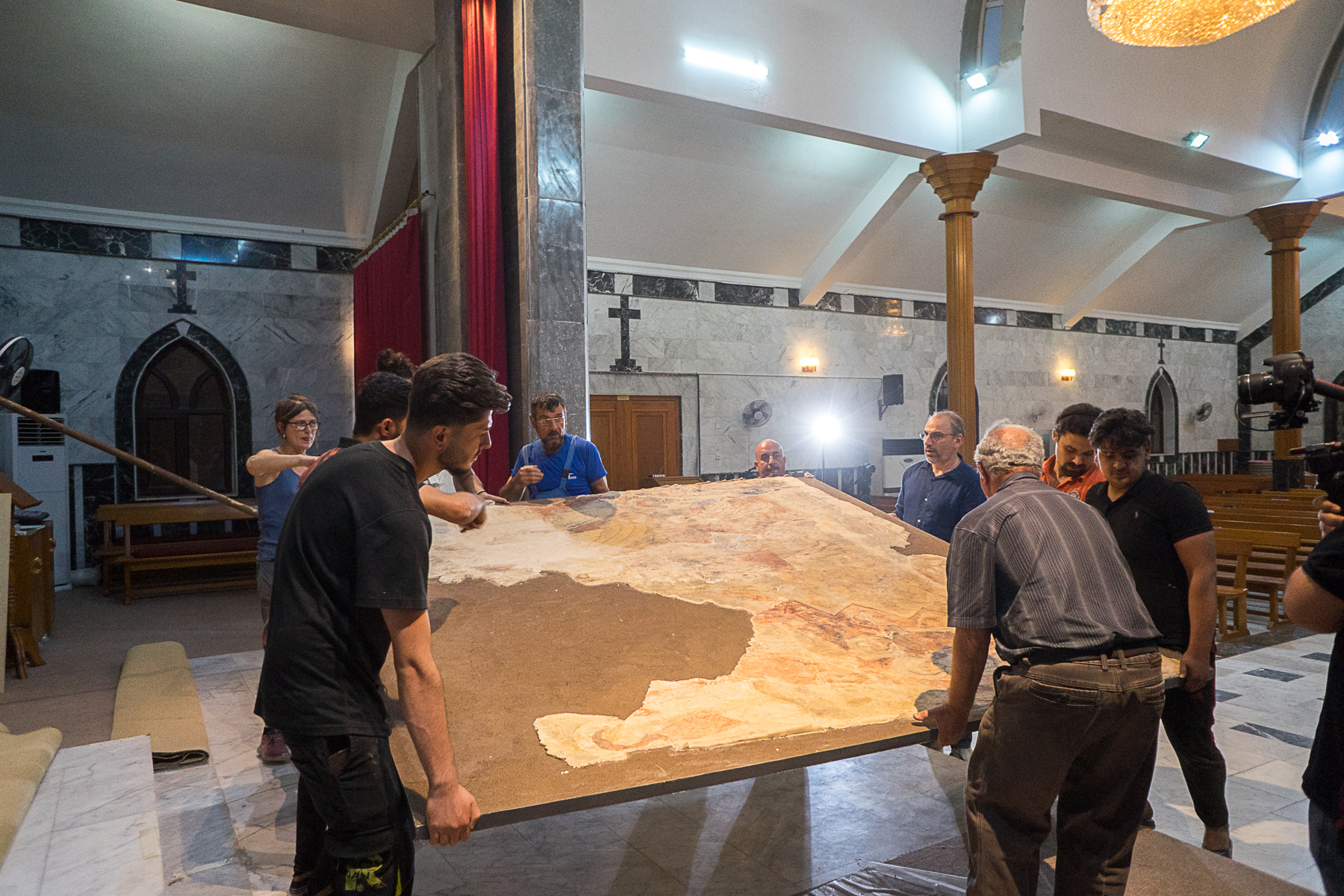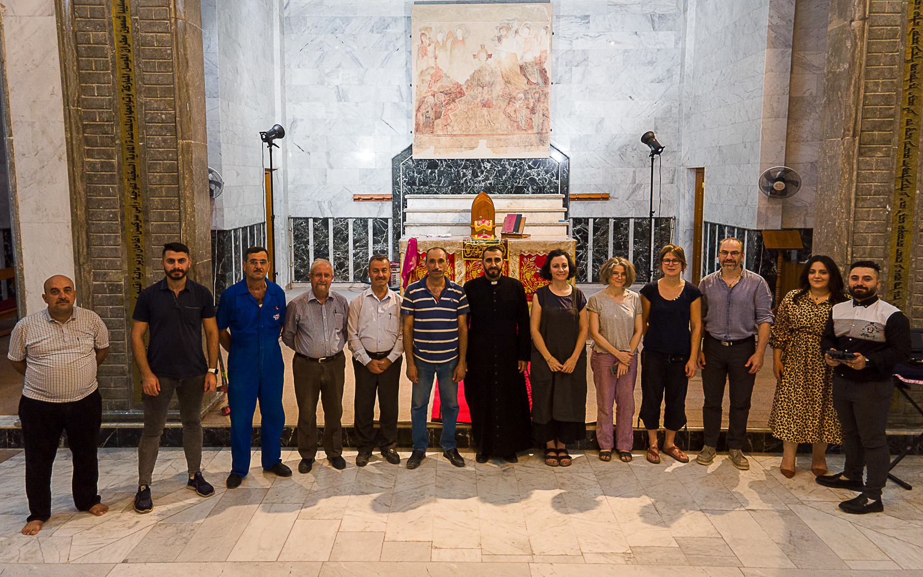 Le 15 novembre dernier, Pascal Maguesyan, notre chargé de mission se rendait sur place pour le début des travaux. Ce fut le commencement d’une grande aventure patrimoniale, accomplie en deux missions consécutives du 15 au 30 novembre 2021, puis du 14 juin au 3 juillet 2022. Après des semaines (et des nuits) de travail intense, cette peinture exceptionnelle a été sauvée, restaurée et présentée le 30 juin 2022 au cours d’une grande soirée inaugurale ! Plus de 500 personnes étaient présentes pour honorer le travail effectué par l’ensemble de l’équipe franco-irakienne, mais aussi pour rendre hommage à un pan de l’histoire des Chrétiens de Mésopotamie.