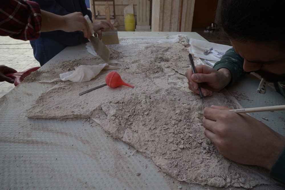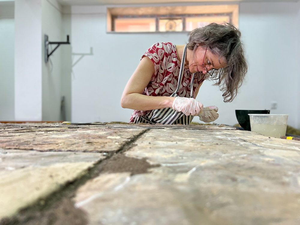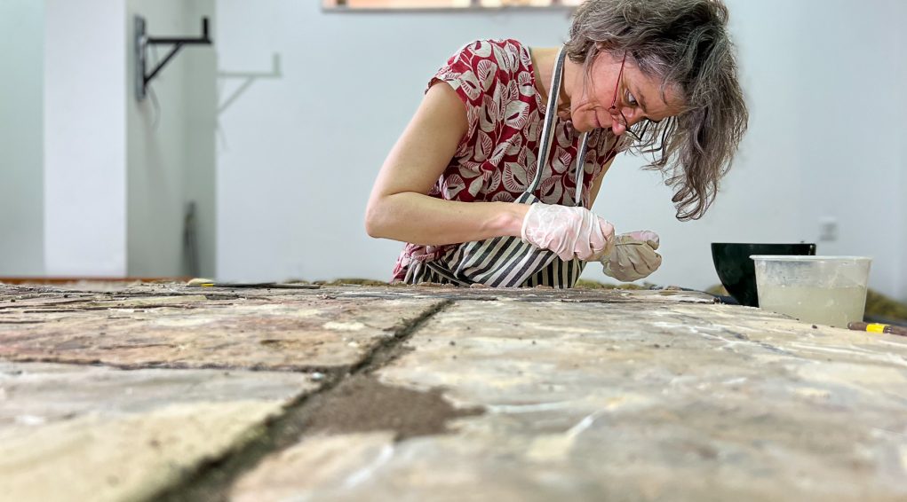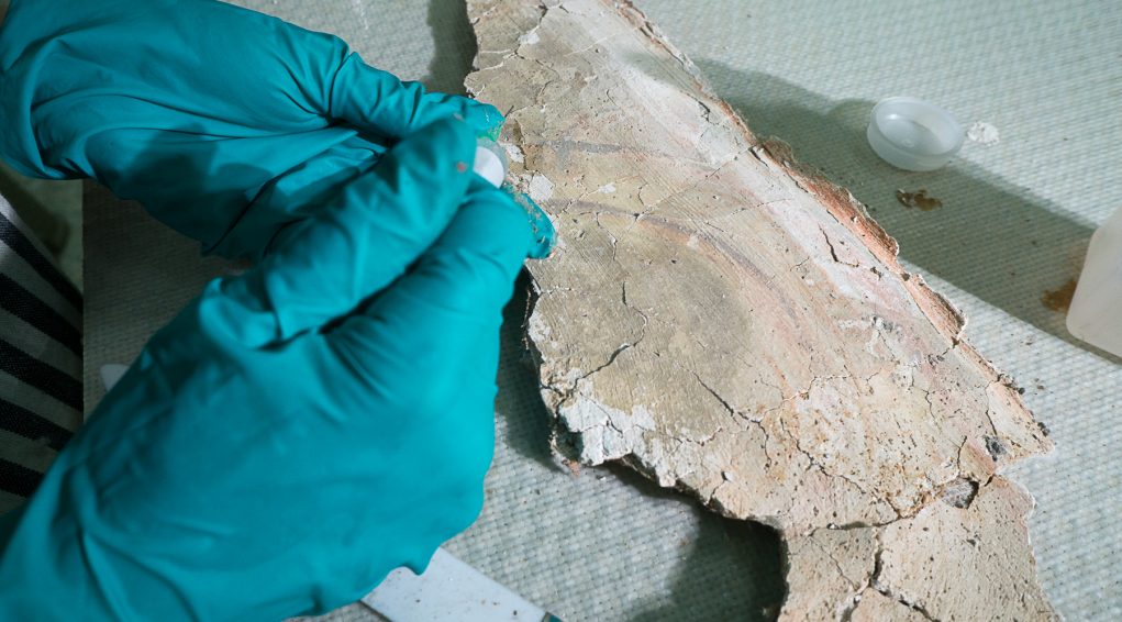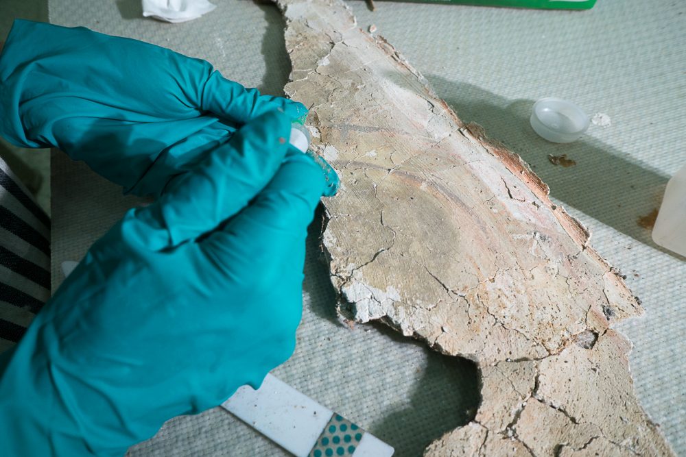 Dans cette vidéo vous verrez tout d’abord Géraldine Fray appliquant les dernières couches d’enduits sur le fragment représentant les Myrrophores.