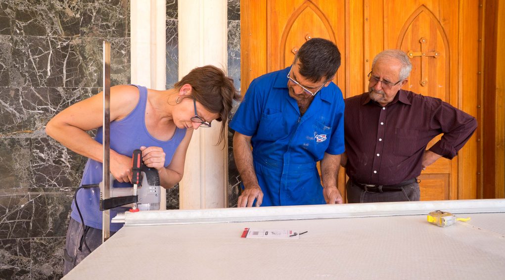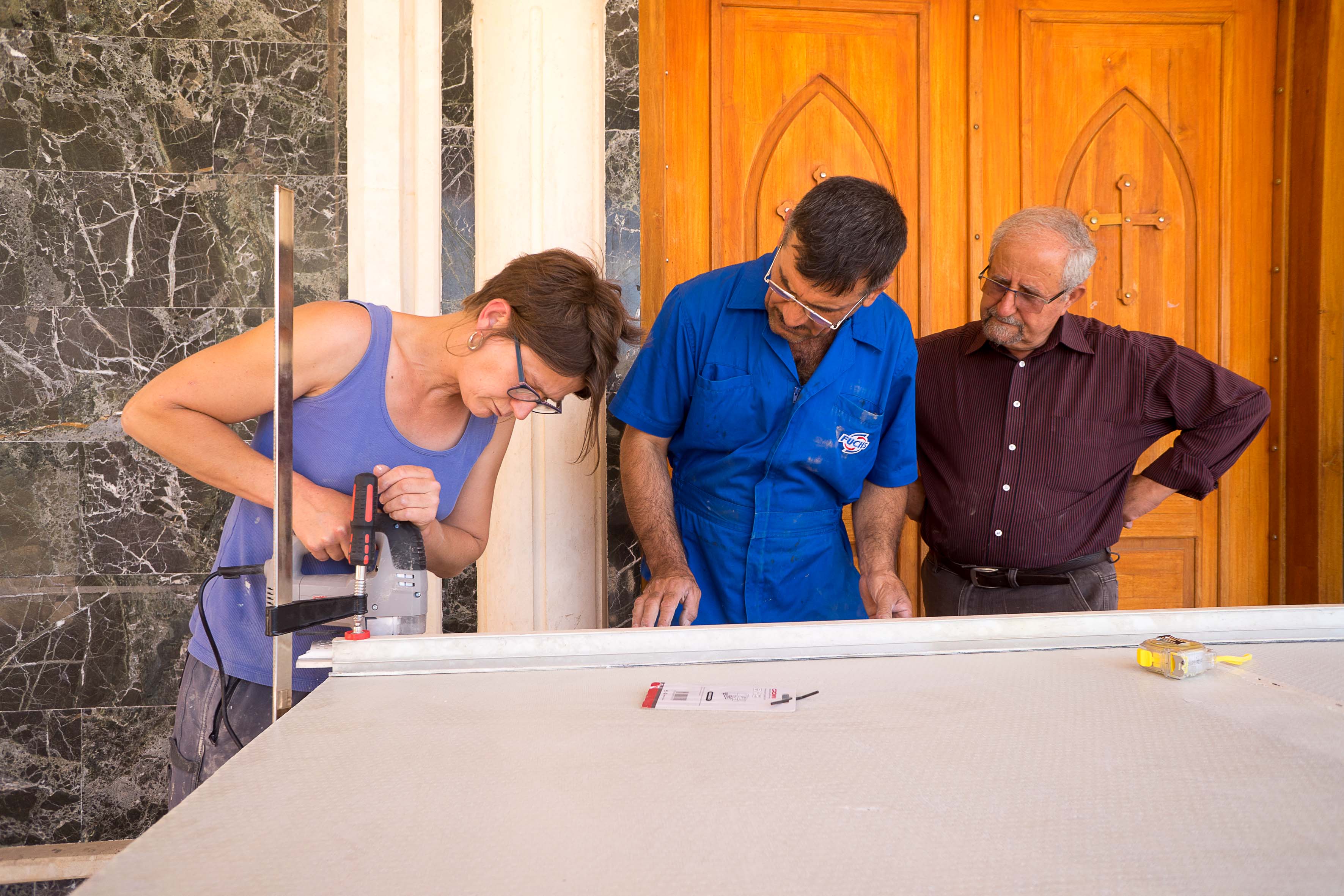Vous allez retrouver Pascal Maguesyan, co-fondateur de l’association Mesopotamia et Géraldine Fray l’une des trois restauratrices qui supervise le chantier pour la levée et l’accrochage de la peinture dans la nouvelle église Mar Guorguis.