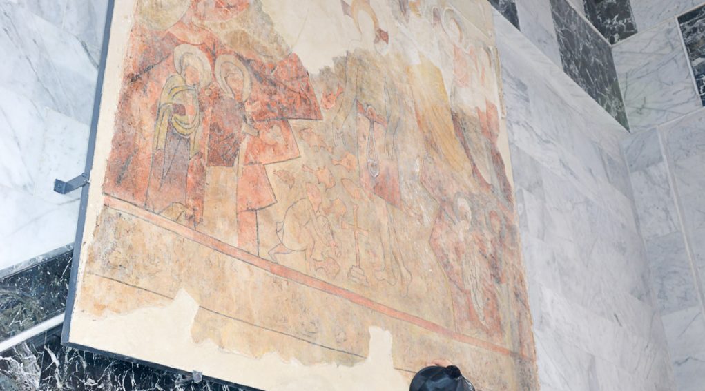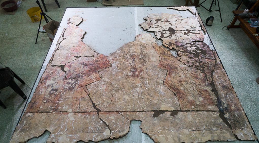 Située initialement sur le mur du sanctuaire de l’ancienne église syriaque-orthodoxe Mar Guorguis de Bakhdida (Qaraqosh) [36°15’56.73″N 43°22’42.57″E et 272 mètres d’altitude], cette peinture murale du XIIIème siècle, était en grand danger de disparition. Elle est l’unique exemplaire de peinture murale médiévale, de style byzantin, existant encore en Mésopotamie. L’association Mesopotamia a mis en œuvre et dirigé son sauvetage et sa restauration, au cours de deux missions, qui se sont déroulées du 15 au 30 novembre 2021 et du 13 juin au 3 juillet 2022. Vous trouverez dans cette page, une vidéo par jour, pour décrire toutes les étapes de cette restauration. Bon visionnage.