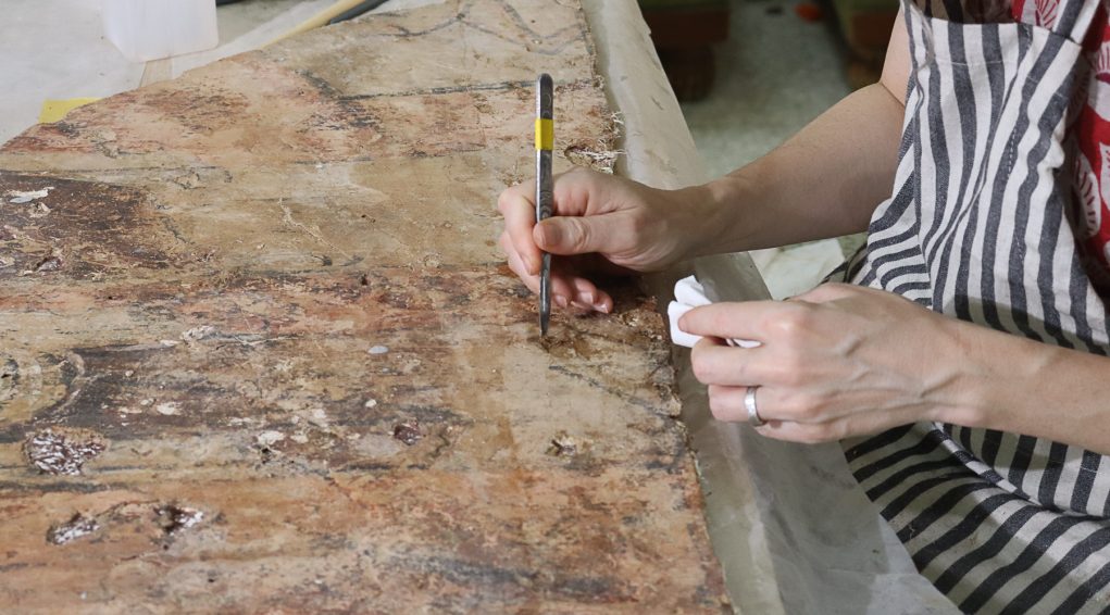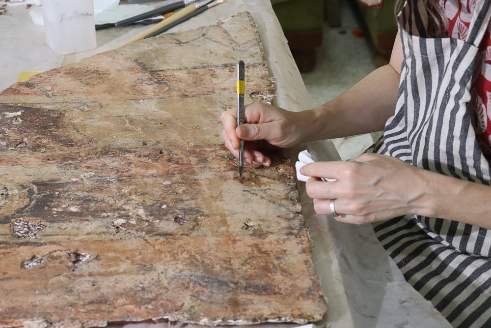 C’est ainsi que procèdent les restauratrices. Après de très longues (et parfois interminables) journées de travail, avec des retouches d’une extrême finesse réalisées millimètre après millimètre, l’œuvre reprend vie, presque subitement. Elle devient lisible, compréhensible et surtout incroyablement belle.