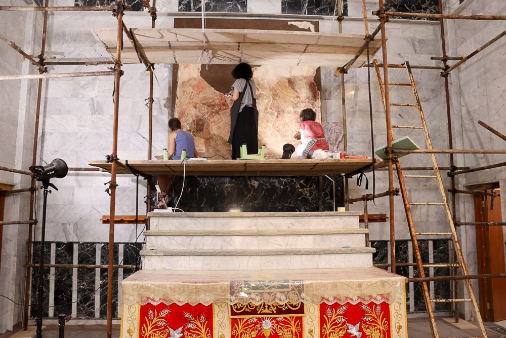 Une fois la peinture accrochée au mur, les échafaudages en place permettront aux restauratrices de terminer les retouches.