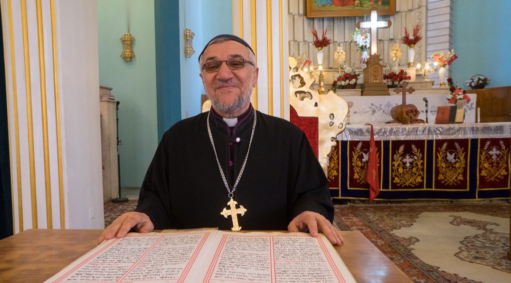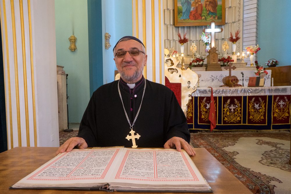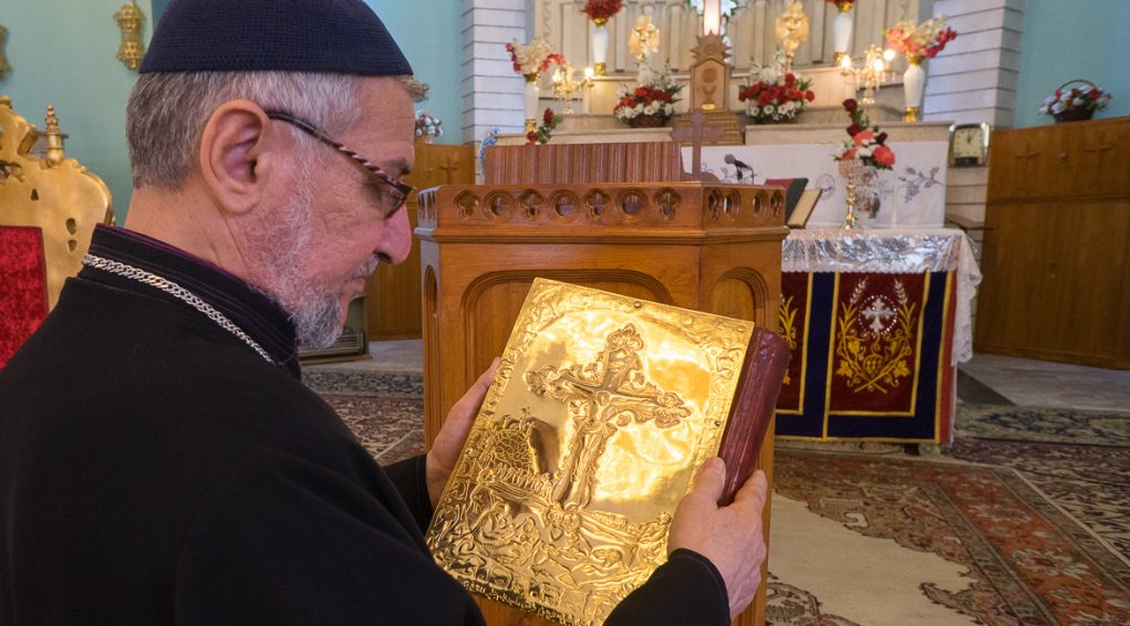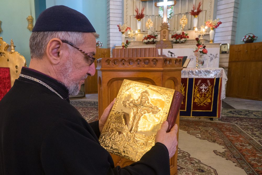 ܐܲܬ݂ܪܵܐ ܡܩܲܕܫܵܐ (المكان المقدس) ܕܟܵܬܸܕܪܵܐܝܼܵܐ: ܦܵܪܹܫ ܡܼܢ ܗܲܝܟܠܵܐ ܕܥܹܕܬܐ ܘܓܘܼܕܵܐ ܕܙܲܡܵܪܹ̈ܐ ܒܐܘܼܪܚܵܐ ܕܚܲܕ ܬܲܪܥܵܐ ܡܲܠܟܵܝܵܐ ܒܐܲܪܒܥܵܐ ܥܲܡܘܼܕܹ̈ܐ: ܕܐܝܼܬ ܠܹܗ ܣܸܬܪܹ̈ܐ ܟܲܒܝܼܪܹ̈ܐ ܡܣܲܩܠܹ̈ܐ ܒܚܲܕ ܨܠܝܼܒ݂ܵܐ ܪܲܒܵܐ ܘܲܕܡܝܼܪܵܐ: ܦܵܬܚܝܼ ܘܣܵܟܪܝܼ ܠܦܘܼܬ݂ ܥܕܵܢܵܬܹ̈ܐ ܛܲܟܣܵܝܹ̈ܐ (ܠܝܼܬܘܿܪ̈ܓ̰ܵܝܹܐ) ݂ ܘܲܒܦܲܠܓܵܐ: ܩܕܵܡܵܐ ܕܐܲܬ݂ܪܵܐ ܡܩܲܕܫܵܐ: ܐܝܼܬ ܚܲܕ ܐܹܘܲܢܓܲܠܝܼܘܿܢ ܡܟܲܣܝܵܐ ܒܚܲܕ ܠܘܼܚܵܐ ܒܕܲܗܒ݂ܵܐ ܕܲܡܛܲܦܣܵܐ ܡܫܝܼܚܵܐ ܨܠܝܼܒ݂ܵܐ ݂ ܘܐܲܬ݂ܪܵܐ ܡܩܲܕܫܵܐ ܐܝܼܬ ܠܹܗ ܬܠܵܬܵܐ ܡܲܕܒܚܹ̈ܐ ݂ ܓܵܢܹܐ ܡܲܕܒܚܵܐ ܪܹܫܵܝܵܐ ܕܐܝܼܬ ܠܹܗ ܕܲܪ̈ܓܹܐ ܡܫܲܚܠܦܹ̈ܐ ܠܐܲܦܲܝ̈ܝ ܡܲܕܢܚܵܐ: ܥܵܠܹܐ ܠܹܗ ܚܕܵܐ ܨܘܼܪܬܐ ܪܲܒܬܐ ܠܲܨܠܵܒ݂ܬܐ ܕܲܡܫܝܼܚܵܐ: ܘܐܝܼܬ ܬܪܹܝܢ ܡܲܕܒܚܹ̈ܐ ܓܹܒܵܢܵܝܹ̈ܐ ܪܵܒܵܐ ܦܫܝܼܛܹ̈ܐ ݂